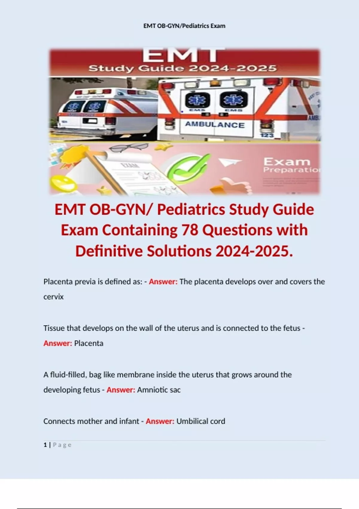 EMT OB-GYN/ Pediatrics Study Guide Exam Containing 78 Questions with Definitive Solutions . Contains Terms like: Placenta previa is defined as: - Answer: The placenta develops over and covers the cervix