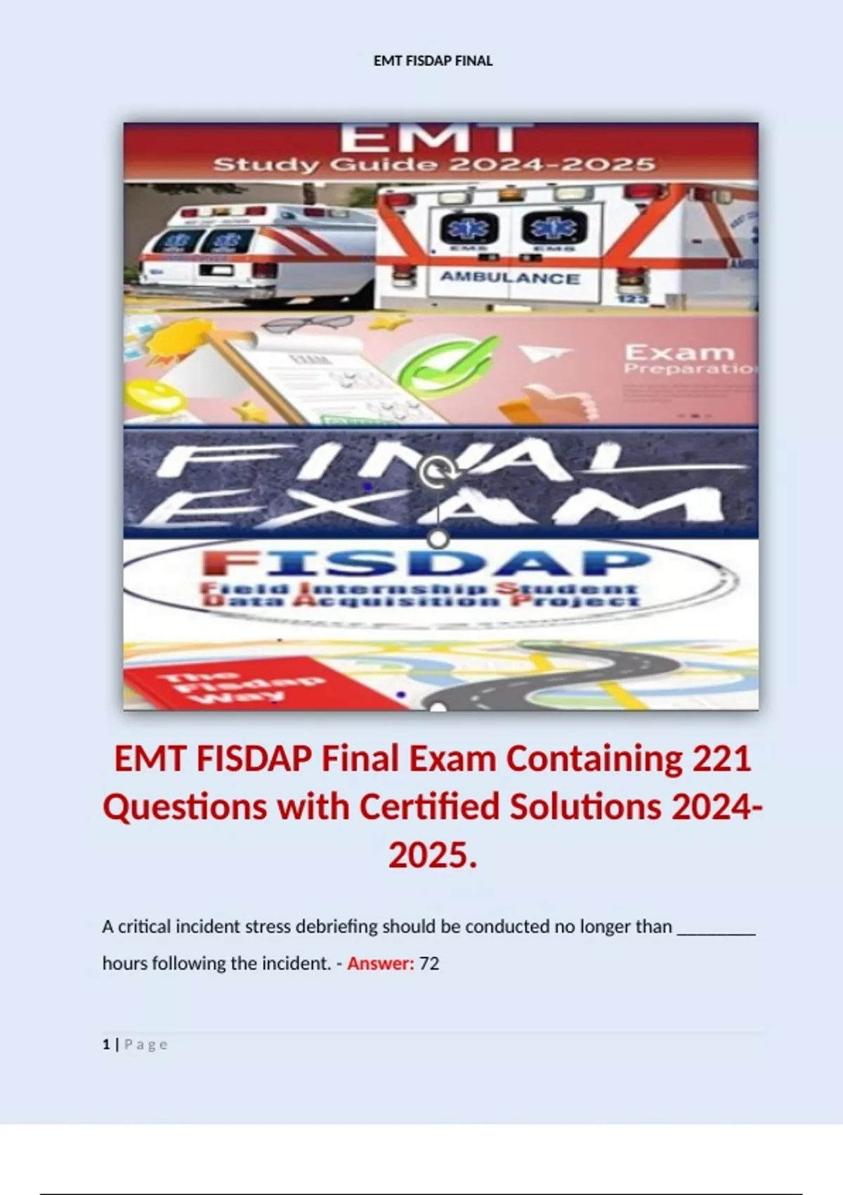 EMT FISDAP Final Exam Containing 221 Questions with Certified Solutions . Terms like: A critical incident stress debriefing should be conducted no longer than ________ hours following the incident. - Answer: 72