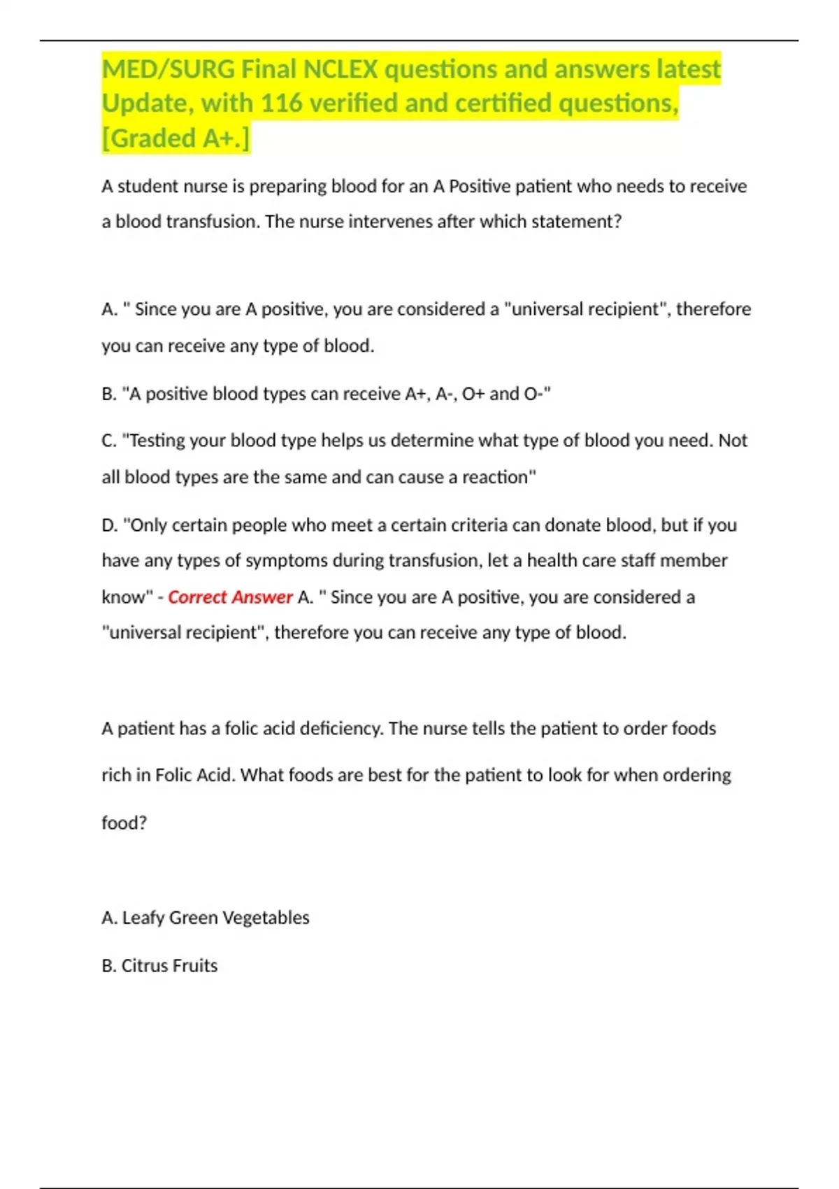 MED/SURG Final NCLEX questions and answers latest Update, with 116 verified and certified questions,Graded A+.
