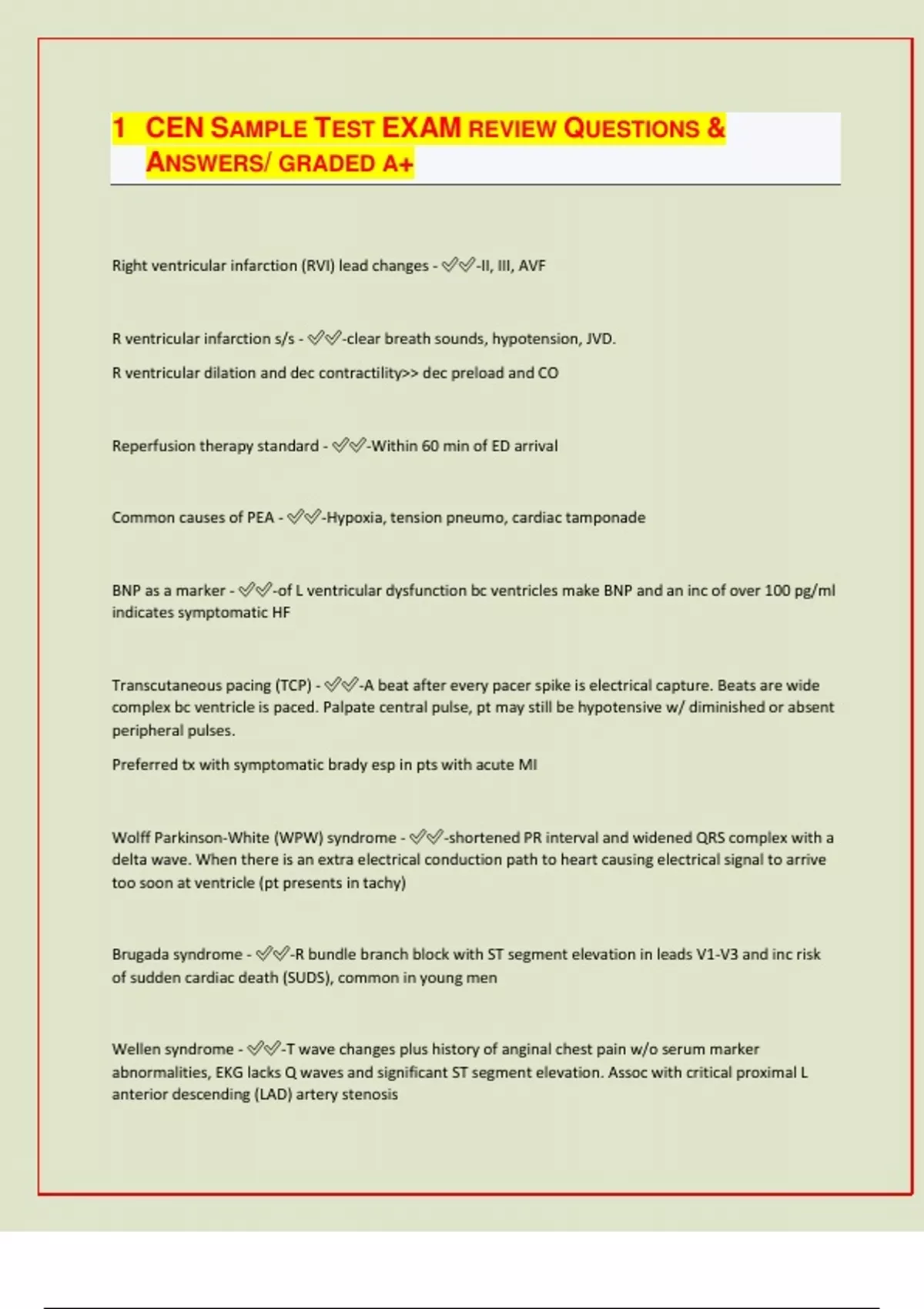 CEN SAMPLE TEST EXAM REVIEW QUESTIONS & ANSWERS/ GRADED A+ Right ventricular infarction (RVI) lead changes - -II, III, AVF R ventricular infarction s/s - -clear breath sounds, hypotension, JVD. R ventricular dilation and dec contractility>> dec preload and CO Reperfusion therapy standard - -Within 60 min of ED arrival Common causes of PEA - -Hypoxia, tension pneumo, cardiac tamponade BNP as a marker - -of L ventricular dysfunction bc ventricles make BNP and an inc of over 100 pg/ml indicates symptomatic HF Transcutaneous pacing (TCP) - -A beat after every pacer spike is electrical capture. Beats are wide complex bc ventricle is paced. Palpate central pulse, pt may still be hypotensive w/ diminished or absent peripheral pulses. Preferred tx with symptomatic brady esp in pts with acute MI Wolff Parkinson-White (WPW) syndrome - -shortened PR interval and widened QRS complex with a delta wave. When there is an extra electrical conduction path to heart causing electrical signal to arrive too soon at ventricle (pt presents in tachy) Brugada syndrome - -R bundle branch block with ST segment elevation in leads V1-V3 and inc risk of sudden cardiac death (SUDS), common in young men Wellen syndrome - -T wave changes plus history of anginal chest pain w/o serum marker abnormalities, EKG lacks Q waves and significant ST segment elevation. Assoc with critical proximal L anterior descending (LAD) artery stenosis Hypothermia associations - -With bradycardia, Osborne (J) waves and prolonged QT intervals Sick sinus syndrome - -Sinoatrial node (SA) the primary heart pacemaker is not functioning properly resulting in bradydysrythmias and/or tachydysrhythmias with potential for hypotension and syncope Morphine and nitrates for tx pulmonary edema - -Results in dec preload or dec venous return>> dec pulmonary congestion How to diagnose endocarditis - -Echocardiogram Pericardiocentesis - -For suspected pericardial effusion or tamponade Primary complication of bowel obstruction - -Dehydration Testicular referred pain is indicative of? - -Duodenal injury S/s pancreatitis - -Sharp, boring, epigastric pain, inc after eating and having alcohol Dx with abd CT scan
