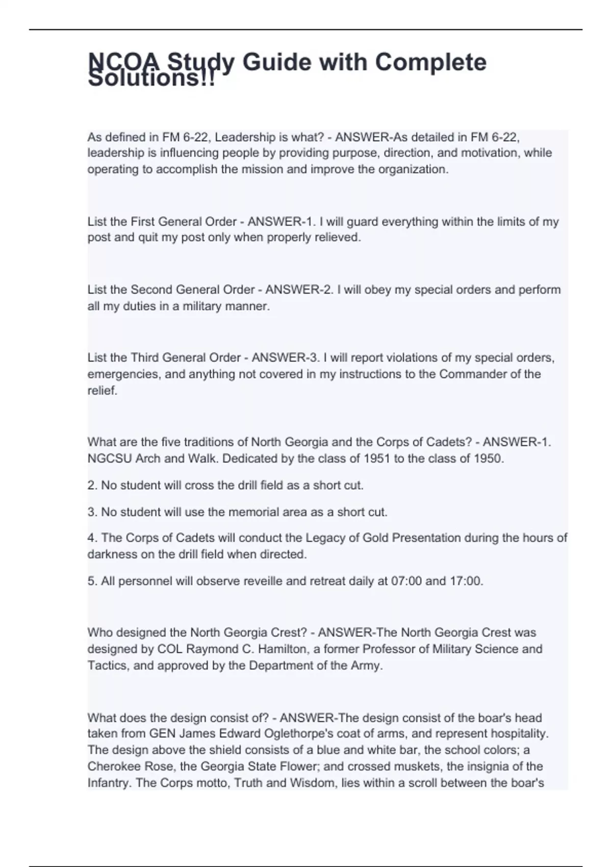 As defined in FM 6-22, Leadership is what? - ANSWER-As detailed in FM 6-22, leadership is influencing people by providing purpose, direction, and motivation, while operating to accomplish the mission and improve the organization. List the First General Order - ANSWER-1. I will guard everything within the limits of my post and quit my post only when properly relieved. List the Second General Order - ANSWER-2. I will obey my special orders and perform all my duties in a military manner. List the Third General Order - ANSWER-3. I will report violations of my special orders, emergencies, and anything not covered in my instructions to the Commander of the relief. What are the five traditions of North Georgia and the Corps of Cadets? - ANSWER-1. NGCSU Arch and Walk. Dedicated by the class of 1951 to the class of 1950. 2. No student will cross the drill field as a short cut. 3. No student will use the memorial area as a short cut. 4. The Corps of Cadets will conduct the Legacy of Gold Presentation during the hours of darkness on the drill field when directed. 5. All personnel will observe reveille and retreat daily at 07:00 and 17:00. Who designed the North Georgia Crest? - ANSWER-The North Georgia Crest was designed by COL Raymond C. Hamilton, a former Professor of Military Science and Tactics, and approved by the Department of the Army.