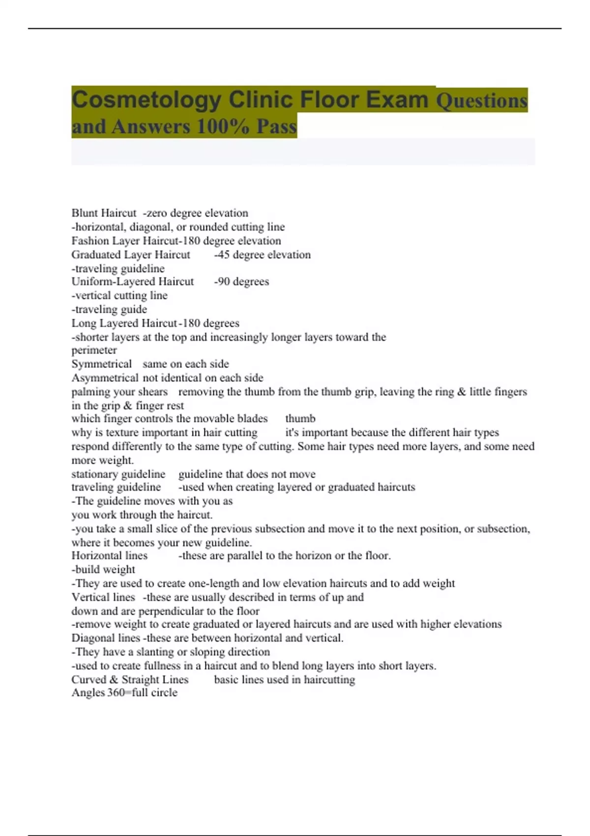 Cosmetology Clinic Floor Exam Questions and Answers 100% Pass Blunt Haircut -zero degree elevation -horizontal, diagonal, or rounded cutting line Fashion Layer Haircut -180 degree elevation Graduated Layer Haircut -45 degree elevation -traveling guideline Uniform-Layered Haircut -90 degrees -vertical cutting line -traveling guide Long Layered Haircut -180 degrees -shorter layers at the top and increasingly longer layers toward the perimeter Symmetrical same on each side Asymmetrical not identical on each side palming your shears removing the thumb from the thumb grip, leaving the ring & little fingers in the grip & finger rest which finger controls the movable blades thumb why is texture important in hair cutting it's important because the different hair types respond differently to the same type of cutting. Some hair types need more layers, and some need more weight. stationary guideline guideline that does not move traveling guideline -used when creating layered or graduated haircuts -The guideline moves with you as you work through the haircut. -you take a small slice of the previous subsection and move it to the next position, or subsection, where it becomes your new guideline. Horizontal lines -these are parallel to the horizon or the floor. -build weight -They are used to create one-length and low elevation haircuts and to add weight Vertical lines -these are usually described in terms of up and down and are perpendicular to the floor -remove weight to create graduated or layered haircuts and are used with higher elevations Diagonal lines -these are between horizontal and vertical. -They have a slanting or sloping direction -used to create fullness in a haircut and to blend long layers into short layers. Curved & Straight Lines basic lines used in haircutting Angles 360=full circle 45=less than 90 degrees 90=1/4 circle 180=half circle basic rule in cutting curly hair -With curly or wavy hair, less tension is better, because a lot of tension will result in the hair shrinking even more than usual as it dries. -anywhere from ½ to 2 inches or more it shrinks -always leave the length longer than the desired end result. Different types of Texturizing Techniques w/ Shears: ~Point cutting ~Notching ~Free-Hand Notching ~Slithering ~Slicing ~Carving Techniques w/ Razor: ~removing weight ~Free-hand slicing Texturizing with Thinning Shears and Razor: ~Removing bulk (thinning) ~Removing weight from the ends. ~Scissor-over-comb with thinning shears. ~Free-hand slicing with razor ~Razor-over-comb ~Razor rotation Closed pin curl produce waves that get smaller toward the end Open pin curl produce even, smooth waves and uniform curls Facial Shapes Diamond Oval Round Inverted triangle Triangle Oblong Square Diamond Face Increase the fullness across the jawline and forehead while keeping the hair close to the head at the cheekbone line. Avoid hairstyles that lift away from the cheeks or move back from the hairline on the sides near the ear area Oval Face any hairstyle will fit this face shape Round Face A hairstyle that has height or volume on top and closeness or no volume at the sides Inverted triangle Face Style the hair close to the head with no volume. A bang or fringe is recommended. Gradually increase the width of the silhouette as you style the middle third of the