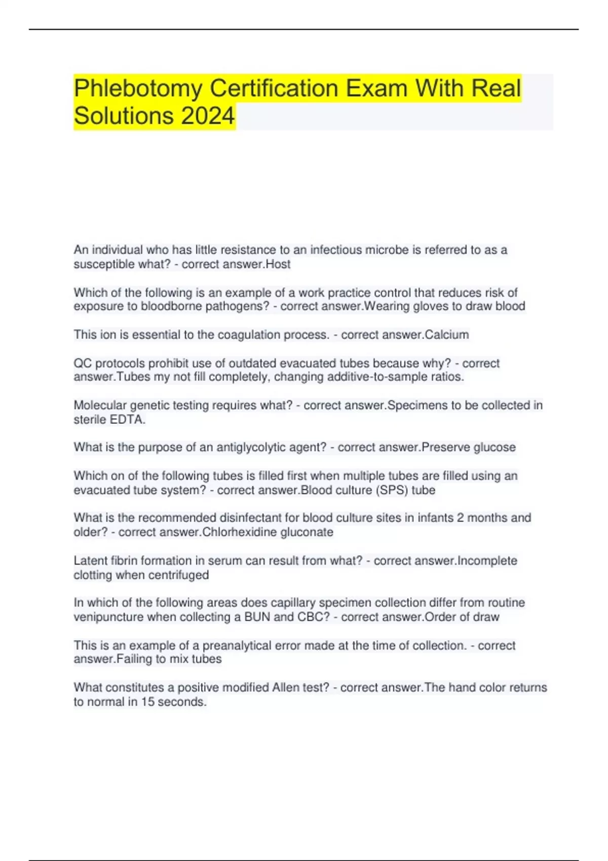 Phlebotomy Certification Exam With Real Solutions 2024