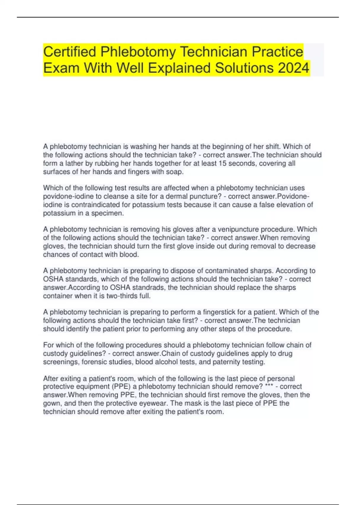 Certified Phlebotomy Technician Practice Exam With Well Explained Solutions 2024
