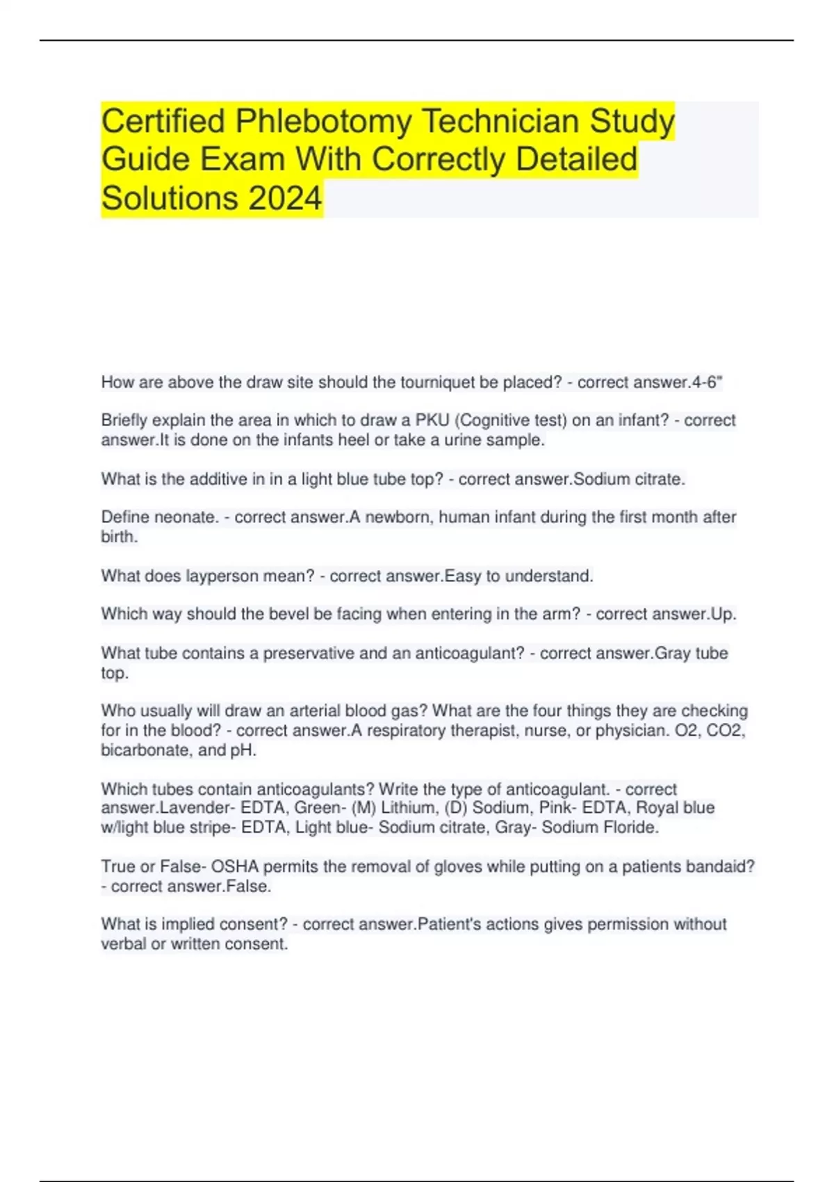 Certified Phlebotomy Technician Study Guide Exam With Correctly Detailed Solutions 2024