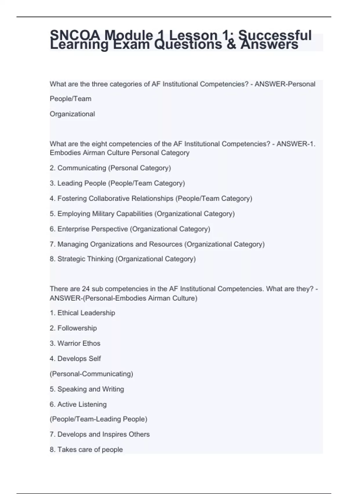 What are the eight competencies of the AF Institutional Competencies? - ANSWER-1. Embodies Airman Culture Personal Category 2. Communicating (Personal Category) 3. Leading People (People/Team Category) 4. Fostering Collaborative Relationships (People/Team Category) 5. Employing Military Capabilities (Organizational Category) 6. Enterprise Perspective (Organizational Category) 7. Managing Organizations and Resources (Organizational Category) 8. Strategic Thinking (Organizational Category) There are 24 sub competencies in the AF Institutional Competencies. What are they? - ANSWER-(Personal-Embodies Airman Culture) 1. Ethical Leadership 2. Followership 3. Warrior Ethos 4. Develops Self (Personal-Communicating) 5. Speaking and Writing 6. Active Listening (People/Team-Leading People) 7. Develops and Inspires Others 8. Takes care of people 9. Diversity (People/Team-Foster Collaborative Relationships) 10. Builds Teams and Coalitions 11. Negotiating