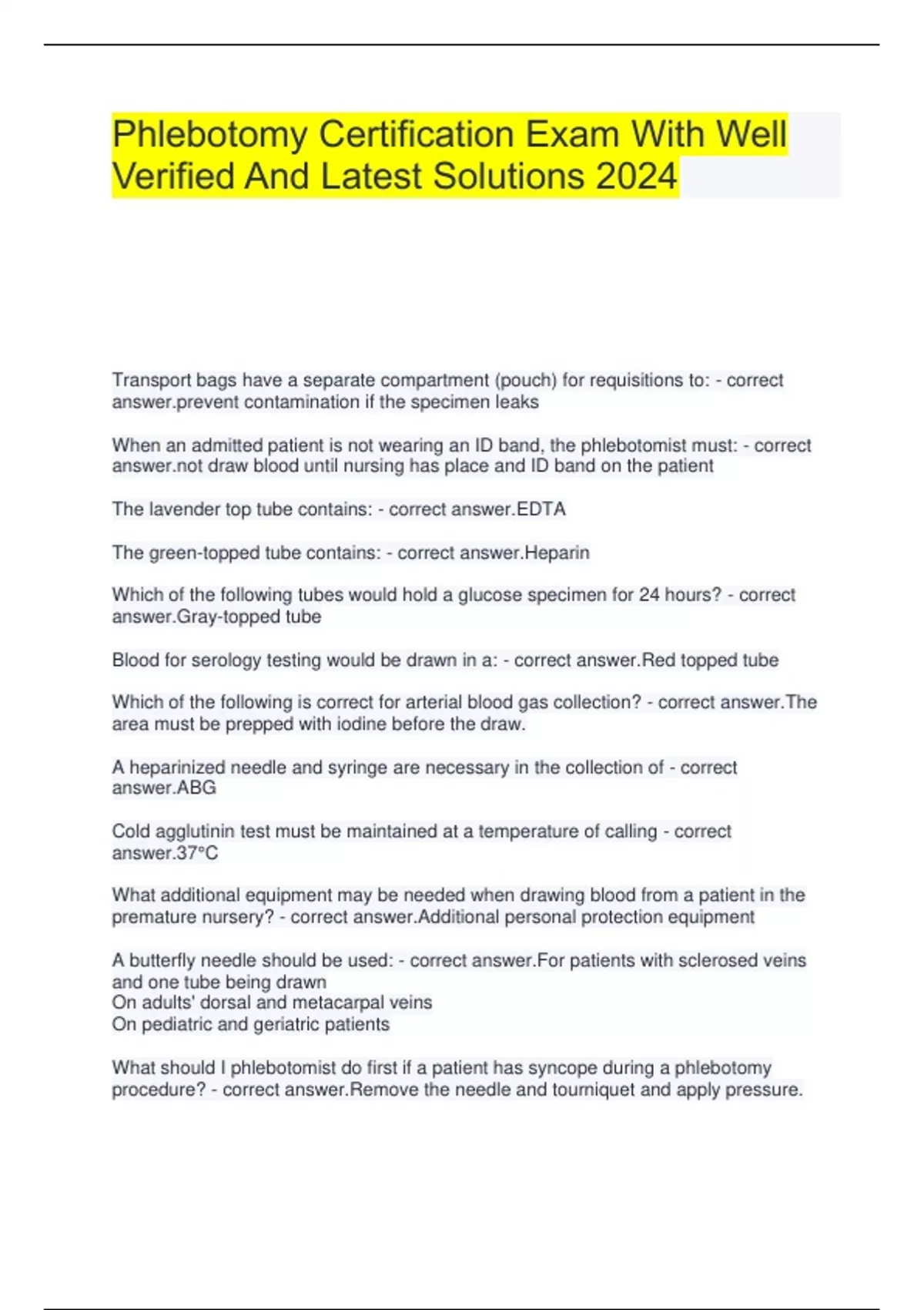 Phlebotomy Certification Exam With Well Verified And Latest Solutions 2024