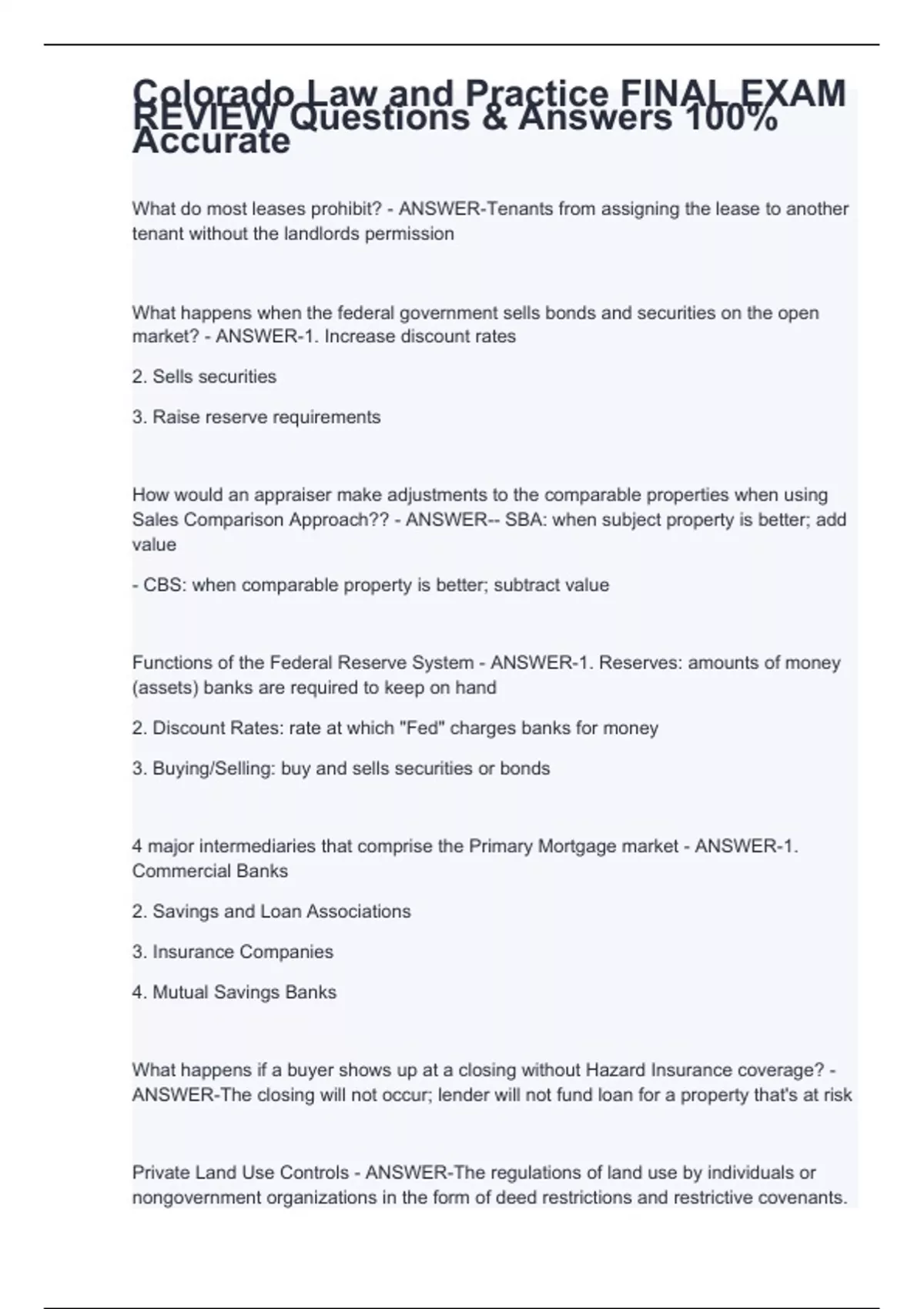 What do most leases prohibit? - ANSWER-Tenants from assigning the lease to another tenant without the landlords permission What happens when the federal government sells bonds and securities on the open market? - ANSWER-1. Increase discount rates 2. Sells securities 3. Raise reserve requirements How would an appraiser make adjustments to the comparable properties when using Sales Comparison Approach?? - ANSWER-- SBA: when subject property is better; add value - CBS: when comparable property is better; subtract value Functions of the Federal Reserve System - ANSWER-1. Reserves: amounts of money (assets) banks are required to keep on hand 2. Discount Rates: rate at which "Fed" charges banks for money 3. Buying/Selling: buy and sells securities or bonds 4 major intermediaries that comprise the Primary Mortgage market - ANSWER-1. Commercial Banks 2. Savings and Loan Associations 3. Insurance Companies 4. Mutual Savings Banks What happens if a buyer shows up at a closing without Hazard Insurance coverage? - ANSWER-The closing will not occur; lender will not fund loan for a property that's at risk