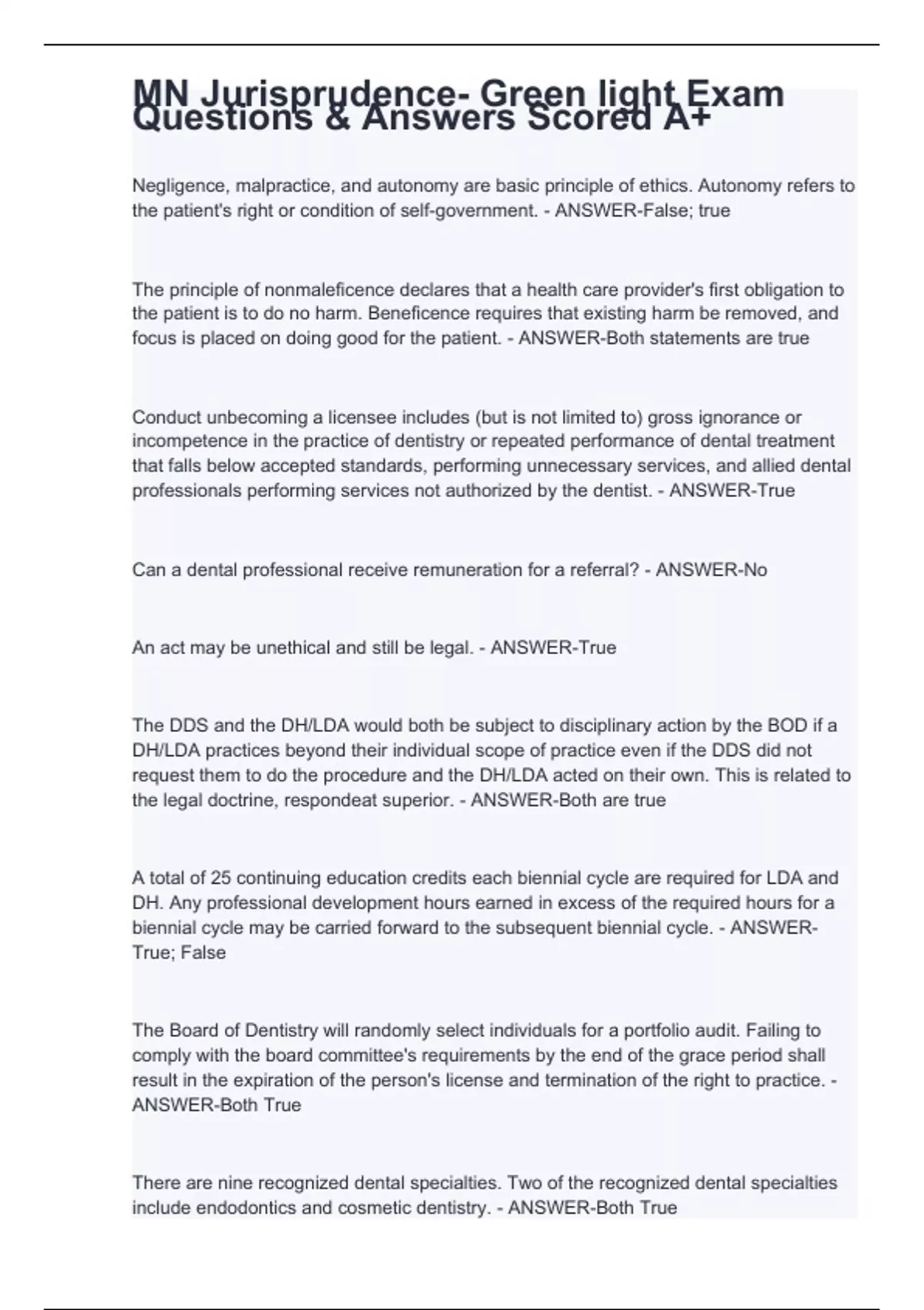 Negligence, malpractice, and autonomy are basic principle of ethics. Autonomy refers to the patient's right or condition of self-government. - ANSWER-False; true The principle of nonmaleficence declares that a health care provider's first obligation to the patient is to do no harm. Beneficence requires that existing harm be removed, and focus is placed on doing good for the patient. - ANSWER-Both statements are true Conduct unbecoming a licensee includes (but is not limited to) gross ignorance or incompetence in the practice of dentistry or repeated performance of dental treatment that falls below accepted standards, performing unnecessary services, and allied dental professionals performing services not authorized by the dentist. - ANSWER-True Can a dental professional receive remuneration for a referral? - ANSWER-No An act may be unethical and still be legal. - ANSWER-True The DDS and the DH/LDA would both be subject to disciplinary action by the BOD if a DH/LDA practices beyond their individual scope of practice even if the DDS did not request them to do the procedure and the DH/LDA acted on their own. This is related to the legal doctrine, respondeat superior. - ANSWER-Both are true A total of 25 continuing education credits each biennial cycle are required for LDA and DH. Any professional development hours earned in excess of the required hours for a biennial cycle may be carried forward to the subsequent biennial cycle. - ANSWER-True; False The Board of Dentistry will randomly select individuals for a portfolio audit. Failing to comply with the board committee's requirements by the end of the grace period shall result in the expiration of the person's license and termination of the right to practice. - ANSWER-Both True
