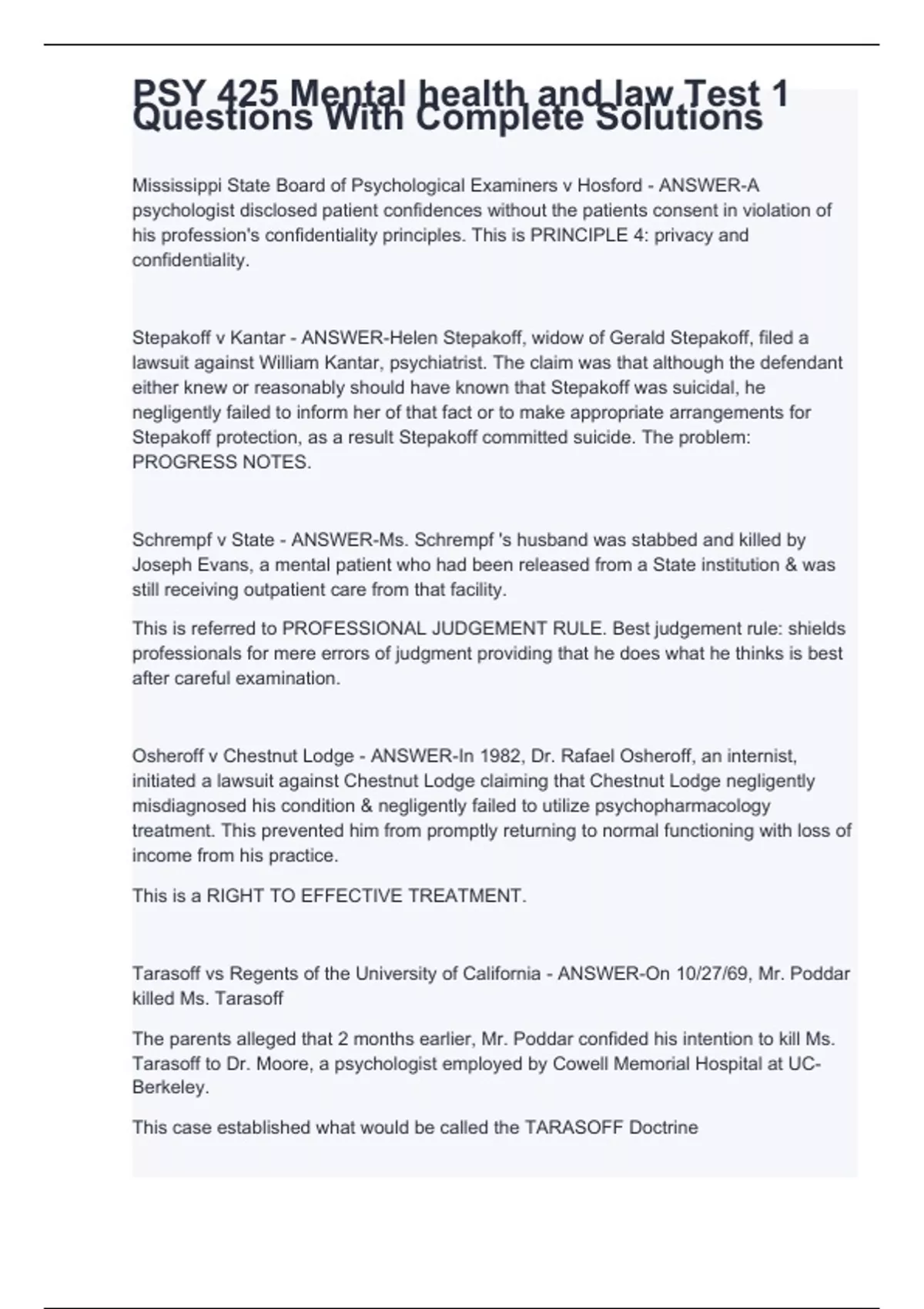 PSY 425 Mental health and law Test 1 Questions With Complete Solutions