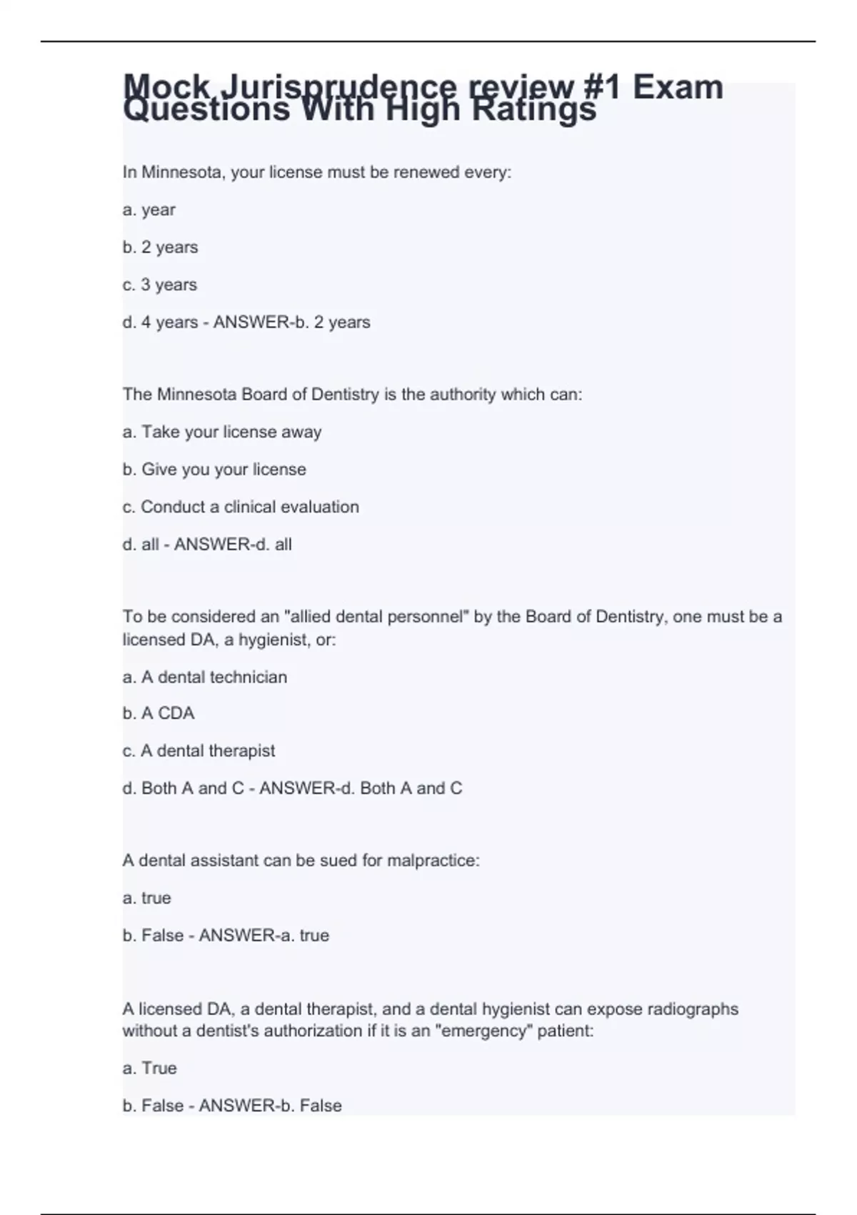 In Minnesota, your license must be renewed every: a. year b. 2 years c. 3 years d. 4 years - ANSWER-b. 2 years The Minnesota Board of Dentistry is the authority which can: a. Take your license away b. Give you your license c. Conduct a clinical evaluation d. all - ANSWER-d. all To be considered an "allied dental personnel" by the Board of Dentistry, one must be a licensed DA, a hygienist, or: a. A dental technician b. A CDA c. A dental therapist d. Both A and C - ANSWER-d. Both A and C A dental assistant can be sued for malpractice: a. true b. False - ANSWER-a. true A licensed DA, a dental therapist, and a dental hygienist can expose radiographs without a dentist's authorization if it is an "emergency" patient: