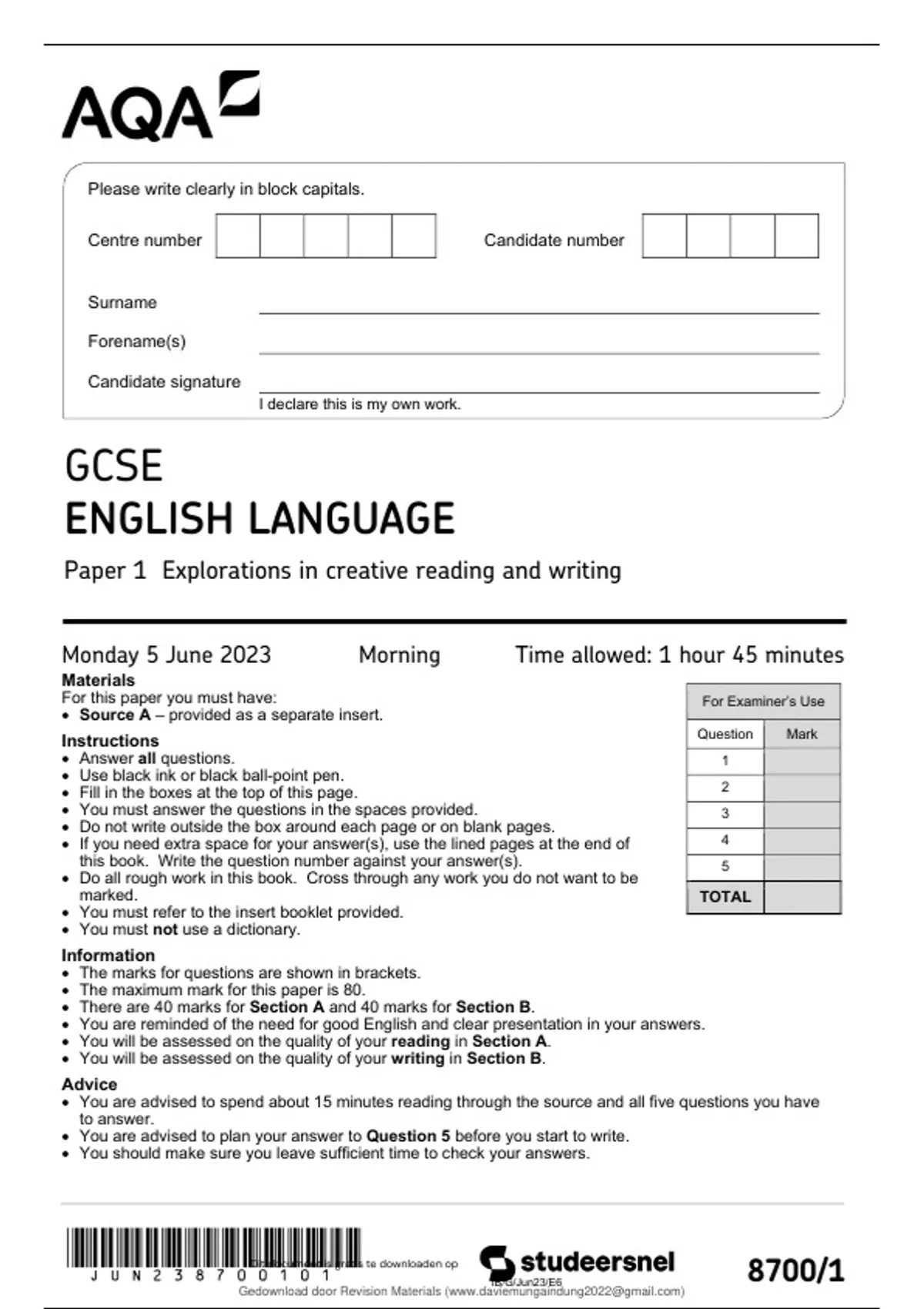 • You are advised to spend about 15 minutes reading through the source and all five questions you have