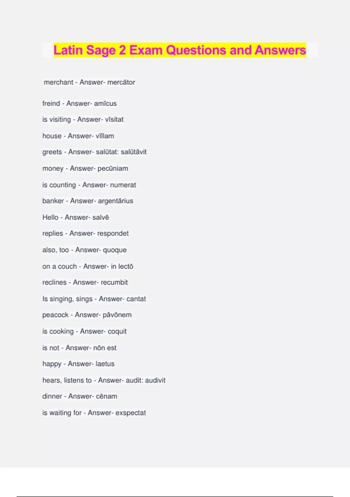 Latin Sage 2 Exam Questions and Answers merchant - Answer- mercātor freind - Answer- amīcus is visiting - Answer- vīsitat house - Answer- vīllam greets - Answer- salūtat: salūtāvit money - Answer- pecūniam is counting - Answer- numerat banker - Answer- argentārius Hello - Answer- salvē replies - Answer- respondet also, too - Answer- quoque on a couch - Answer- in lectō reclines - Answer- recumbit Is singing, sings - Answer- cantat