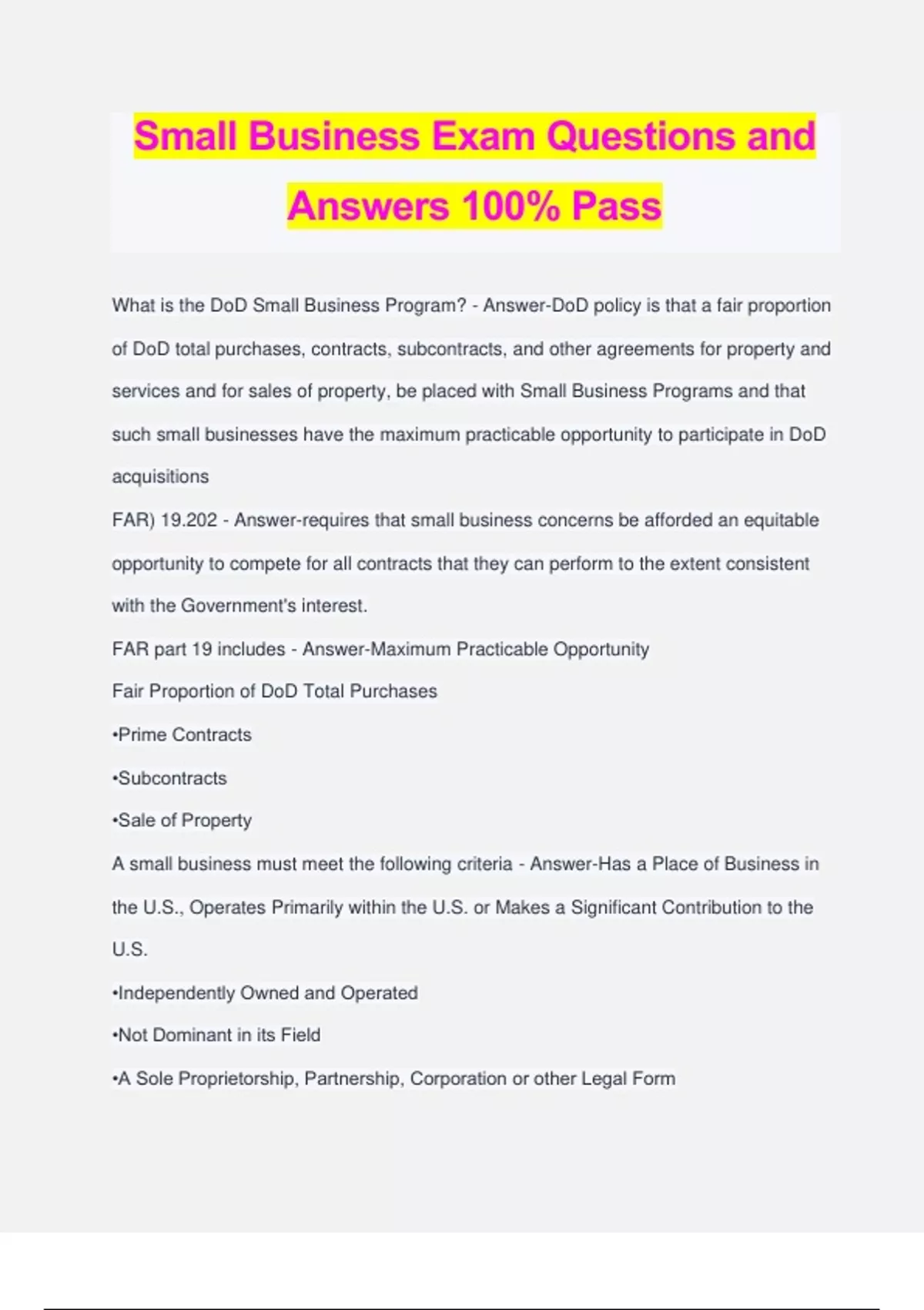 Small Business Exam Questions and Answers 100% Pass What is the DoD Small Business Program? - Answer-DoD policy is that a fair proportion of DoD total purchases, contracts, subcontracts, and other agreements for property and services and for sales of property, be placed with Small Business Programs and that such small businesses have the maximum practicable opportunity to participate in DoD acquisitions FAR) 19.202 - Answer-requires that small business concerns be afforded an equitable opportunity to compete for all contracts that they can perform to the extent consistent with the Government's interest. FAR part 19 includes - Answer-Maximum Practicable Opportunity Fair Proportion of DoD Total Purchases •Prime Contracts •Subcontracts •Sale of Property A small business must meet the following criteria - Answer-Has a Place of Business in the U.S., Operates Primarily within the U.S. or Makes a Significant Contribution to the U.S. •Independently Owned and Operated •Not Dominant in its Field •A Sole Proprietorship, Partnership, Corporation or other Legal Form Categories of Small Business include - Answer-Woman-Owned Small Business (WOSB) Economically Disadvantaged Women-Owned Small Business (EDWOSB) •Small Disadvantaged Business (SDB) o 8(a) Certified Small Business •Veteran-Owned Small Business (VOSB) •Service-Disabled Veteran-Owned Small Business (SDVOSB) •Historically Underutilized Business Zone Small Business (HUBZone) Woman-Owned Small Business (WOSB) - Answer-a small business concern that is at least 51% owned and controlled by women. Small Disadvantaged Business (SDB) - Answer-a small business that is at least 51% owned and controlled by a socially and economically disadvantaged individual or individuals. 8(a) Certified Small Business - Answer-participants can receive sole-source contracts, up to a ceiling, including options, of $4 million for goods and services and $6.5 million for manufacturing. Veteran Owned Small Business (VOSB) - Answer-small business concern that is at least 51% owned and controlled by veterans. VOSBs are self-identifying. Service Disabled Veteran Owned Small Business (SDVOSB) - Answer-participants can receive sole-source contracts, up to a ceiling, including options, of $6 million for manufacturing and $3.5 million for any other NAICS code. HUBZone Small Business - Answer-established to promote job growth, capital investment, and economic development to historically underutilized business zones, by providing contracting assistance to small businesses located in these economically distressed communities. Initial Planning - Answer-we conduct market research to determine whether there is a commercial solution available and whether small business can provide that solution. Market Research - Answer-one of the steps in the Acquisition Process where Contracting Officers can promote ma opportunity for small bus. utilization Pre-Solicitation Phase - Answer-Initial Planning, Market Research, Acquisition Planning, Procurement Request, SOW/PWS/SOO, and Factors/Sub-factors Solicitation Award Phase - Answer-Solicitation [Request for Quote (RFQ), Invitation for Bids (IFB), solicitation] Evaluation (Technical, cost/price, past performance, Small Business Participation) •Negotiation •Award What is DoD Policy regarding Small Business? Be sure to include some of the main small business categories - Answer-DoD Policy requires us to provide maximum practicable opportunity to small businesses, and there are specific rules covering the proportion of DoD total purchases, Prime Contracts, Subcontracts, and Sale of Property. It's in the FAR part 19. Acquisition Team - Answer-composed of many different participants who work together to navigate through the acquisition process. Each team member has specific tasks and is empowered to make decisions within their areas of responsibility. Tools that help identify small business candidates include - Answer-Requests for Information (RFI) issued by Contracting Officer • Sources Sought Synopsis issued by Contracting Officer • General Services Administration (GSA) Schedules Yellow pages • Professional trade organizations • Trade shows • Networking • Internet Searches Contracting Officer with the support of the Contracting Specialist, is responsible for - Answer-Establishing a feasible and appropriate acquisition strategy • Reviewing requirements, evaluation criteria, and cost estimates • Serving as the official point of contact between the government and industry • Coordinating final review of the acquisition package to identify contractual impacts • Ensure customer provides sufficient funding • Ensuring that contractors receive fair, impartial, and equitable treatment • Planning and coordinating source selection Administering, modifying, and terminating the resulting contract • Ensuring that all laws, executive orders, legislation, and applicable procedures are met Small Business Professionals help small businesses - Answer-Market their products and services with DoD • Follow defense procurement procedures • Be placed on the solicitation mailing lists • Identify prime contract and subcontract opportunities (Rule of Two) Small Business Professionals can provide valuable assistance to the Acquisition Team in: - Answer-Helping plan the milestone schedule • Defining the acquisition strategy which produces better value and lower costs • Guiding team members in determining the appropriate level of market research alternatives and sources • Assisting team members in understanding small busin