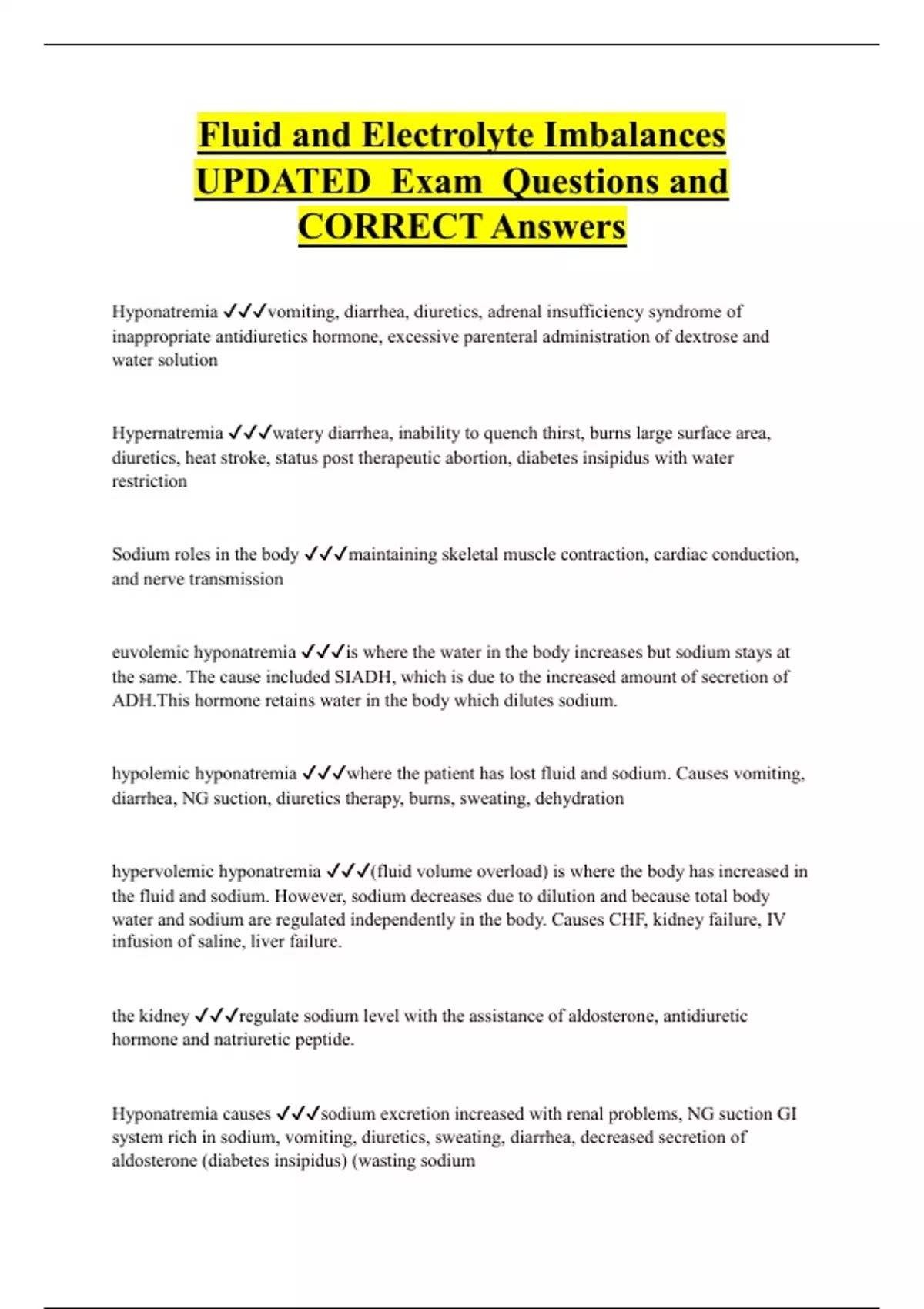 Fluid and Electrolyte Imbalances UPDATED Exam Questions and CORRECT Answers