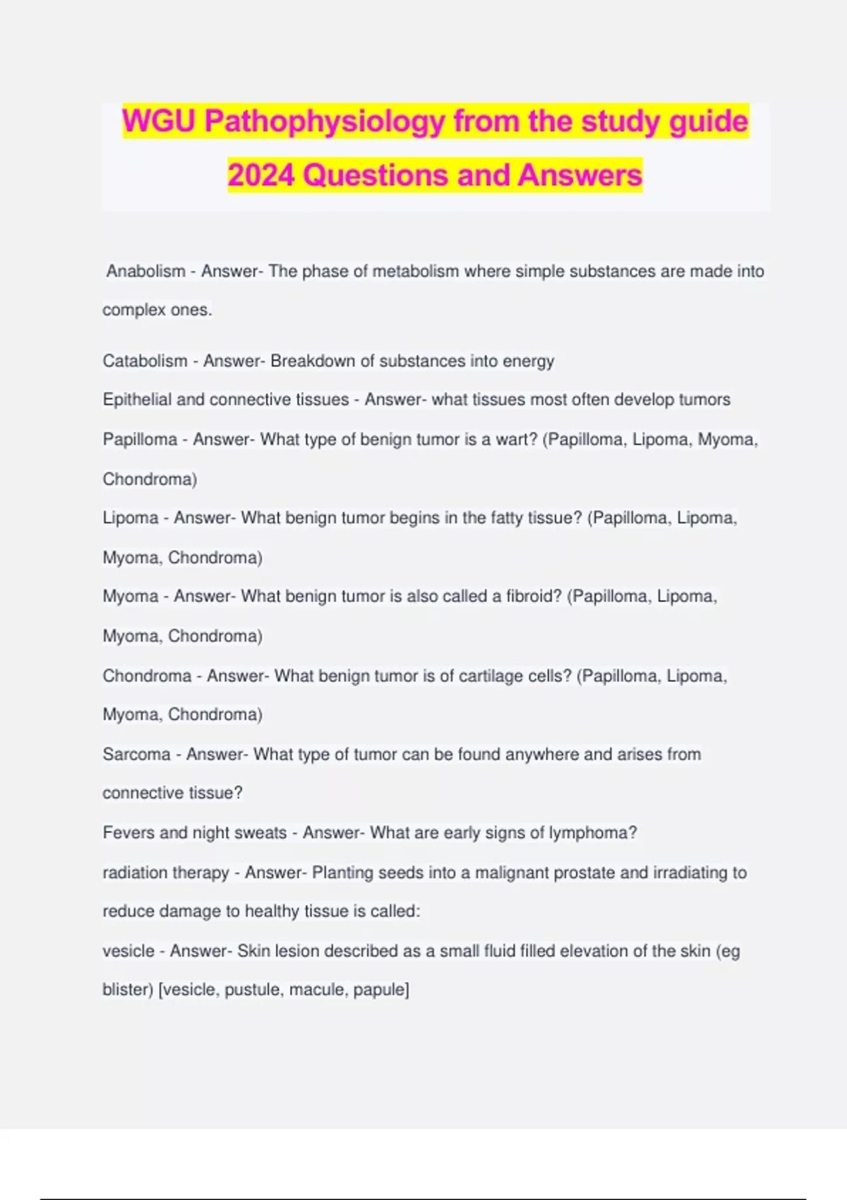WGU Pathophysiology from the study guide 2024 Questions and Answers Anabolism - Answer- The phase of metabolism where simple substances are made into complex ones. Catabolism - Answer- Breakdown of substances into energy Epithelial and connective tissues - Answer- what tissues most often develop tumors Papilloma - Answer- What type of benign tumor is a wart? (Papilloma, Lipoma, Myoma, Chondroma) Lipoma - Answer- What benign tumor begins in the fatty tissue? (Papilloma, Lipoma, Myoma, Chondroma) Myoma - Answer- What benign tumor is also called a fibroid? (Papilloma, Lipoma, Myoma, Chondroma) Chondroma - Answer- What benign tumor is of cartilage cells? (Papilloma, Lipoma, Myoma, Chondroma) Sarcoma - Answer- What type of tumor can be found anywhere and arises from connective tissue? Fevers and night sweats - Answer- What are early signs of lymphoma? radiation therapy - Answer- Planting seeds into a malignant prostate and irradiating to reduce damage to healthy tissue is called: vesicle - Answer- Skin lesion described as a small fluid filled elevation of the skin (eg blister) [vesicle, pustule, macule, papule] pustule - Answer- Skin lesion described as an elevation of the skin containing white blood cells and cell debris [vesicle, pustule, macule, papule] macule - Answer- Skin lesion described as a spot not raised or depressed (eg freckle) [vesicle, pustule, macule, papule] papule - Answer- Skin lesion described as a firm raised area of skin (eg pimple] [vesicle, pustule, macule, papule] excoriation - Answer- Skin lesions described as a scratch into the skin. laceration - Answer- Skin trauma- rough, jagged wound caused by skin tearing: fissure - Answer- Skin trauma- crack in the skin ulcer - Answer- skin trauma - sore with disintegration and death of affected tissue superficial burn - Answer- Burn involving only the epidermal layer of the skin. Blisters and pain at the burn site. - Answer- How do superficial partial thickness burns present? shingles - Answer- Painful vesicular lesions caused by varicella. normal treatment is antiviral medications and corticosteroids to decrease pain. superficial - Answer- Tissue destruction involving only the epidermal layer of the skin is called: Pruritus and urticarial - Answer- What are two signs of allergic skin reactions? They are all autoimmune diseases involving the skin - Answer- What do Pemphigus, scleroderma and lupus erythematosus have in common? Disturb equilibrium - Answer- What can damage to the semicircular canals in the ears do? Placing a myringotomy tube in the ear - Answer- How can otitis media be prevented? Presbycusis - Answer- What is age related hearing loss called? Speaking in clear low pitched tones - Answer- What can alleviate age -related hearing loss (Presbycusis)? arthrocentesis, laparoscopic repairs, and fixation of screws - Answer- What can treatment of joint disorders include? Gout - Answer- Form of arthritis described as a hi