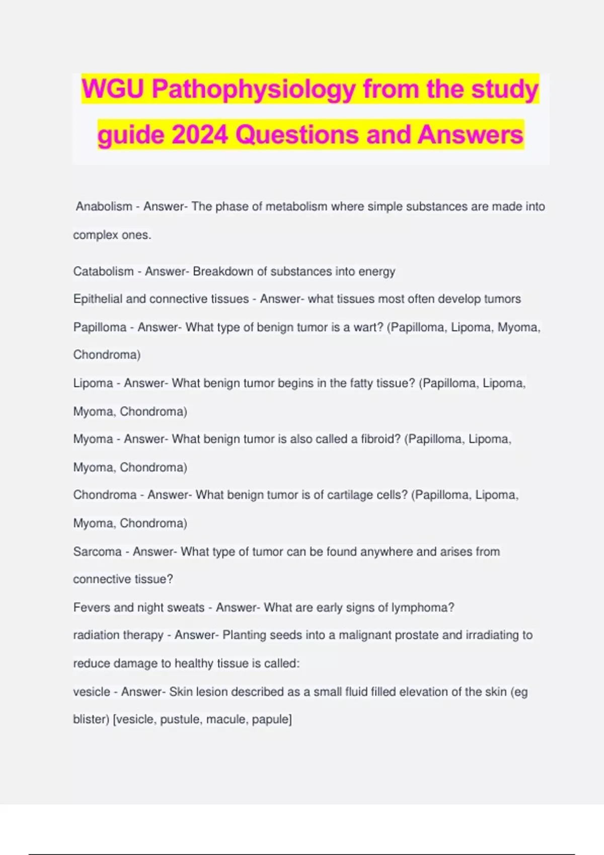 WGU Pathophysiology from the study guide 2024 Questions and Answers Anabolism - Answer- The phase of metabolism where simple substances are made into complex ones. Catabolism - Answer- Breakdown of substances into energy Epithelial and connective tissues - Answer- what tissues most often develop tumors Papilloma - Answer- What type of benign tumor is a wart? (Papilloma, Lipoma, Myoma, Chondroma) Lipoma - Answer- What benign tumor begins in the fatty tissue? (Papilloma, Lipoma, Myoma, Chondroma) Myoma - Answer- What benign tumor is also called a fibroid? (Papilloma, Lipoma, Myoma, Chondroma) Chondroma - Answer- What benign tumor is of cartilage cells? (Papilloma, Lipoma, Myoma, Chondroma) Sarcoma - Answer- What type of tumor can be found anywhere and arises from connective tissue? Fevers and night sweats - Answer- What are early signs of lymphoma? radiation therapy - Answer- Planting seeds into a malignant prostate and irradiating to reduce damage to healthy tissue is called: vesicle - Answer- Skin lesion described as a small fluid filled elevation of the skin (eg blister) [vesicle, pustule, macule, papule] pustule - Answer- Skin lesion described as an elevation of the skin containing white blood cells and cell debris [vesicle, pustule, macule, papule] macule - Answer- Skin lesion described as a spot not raised or depressed (eg freckle) [vesicle, pustule, macule, papule] papule - Answer- Skin lesion described as a firm raised area of skin (eg pimple] [vesicle, pustule, macule, papule] excoriation - Answer- Skin lesions described as a scratch into the skin. laceration - Answer- Skin trauma- rough, jagged wound caused by skin tearing: fissure - Answer- Skin trauma- crack in the skin ulcer - Answer- skin trauma - sore with disintegration and death of affected tissue superficial burn - Answer- Burn involving only the epidermal layer of the skin. Blisters and pain at the burn site. - Answer- How do superficial partial thickness burns present? shingles - Answer- Painful vesicular lesions caused by varicella. normal treatment is antiviral medications and corticosteroids to decrease pain. superficial - Answer- Tissue destruction involving only the epidermal layer of the skin is called: Pruritus and urticarial - Answer- What are two signs of allergic skin reactions? They are all autoimmune diseases involving the skin - Answer- What do Pemphigus, scleroderma and lupus erythematosus have in common? Disturb equilibrium - Answer- What can damage to the semicircular canals in the ears do? Placing a myringotomy tube in the ear - Answer- How can otitis media be prevented? Presbycusis - Answer- What is age related hearing loss called? Speaking in clear low pitched tones - Answer- What can alleviate age -related hearing loss (Presbycusis)? arthrocentesis, laparoscopic repairs, and fixation of screws - Answer- What can treatment of joint disorders include? Gout - Answer- Form of arthritis described as a higher level of uric acid crystals accumulating in joint Septic arthritis - Answer- Form of arthritis that may result from an invasive procedure, organisms carried to the joint by the blood stream. Osteoarthritis - Answer- Form of arthritis that may be the results of aging and repeated trauma most often in weight-bearing joints. Rheumatoid arthritis - Answer- Form of arthritis described as an inflammation and overgrowth of synovial fluid causing severe pain; joints stiffen and become useless Myasthenia gravis - Answer- What can be described as chronic muscular fatigue caused by defect at the neuromuscular junction? By taking antacid medications, and using medications that decrease production of hydrochloric acid. - Answer- How can gastroesophageal reflux disease be treated? Chronic pancreatitis - Answer- What can be characterized with severe pain and blood tests that show elevated serum amylase? Pancreatitis - Answer- What impacts the digestive process by leading to enzyme imbalances? Testing blood serology - Answer- How is viral hepatitis identified? Bowel fucntion - Answer- What does chronic hepatitis often exhibit changes in? an antigen-antibody reaction - Answer- What could arise if an Rh negative patient experiences a second exposure to Rh positive blood