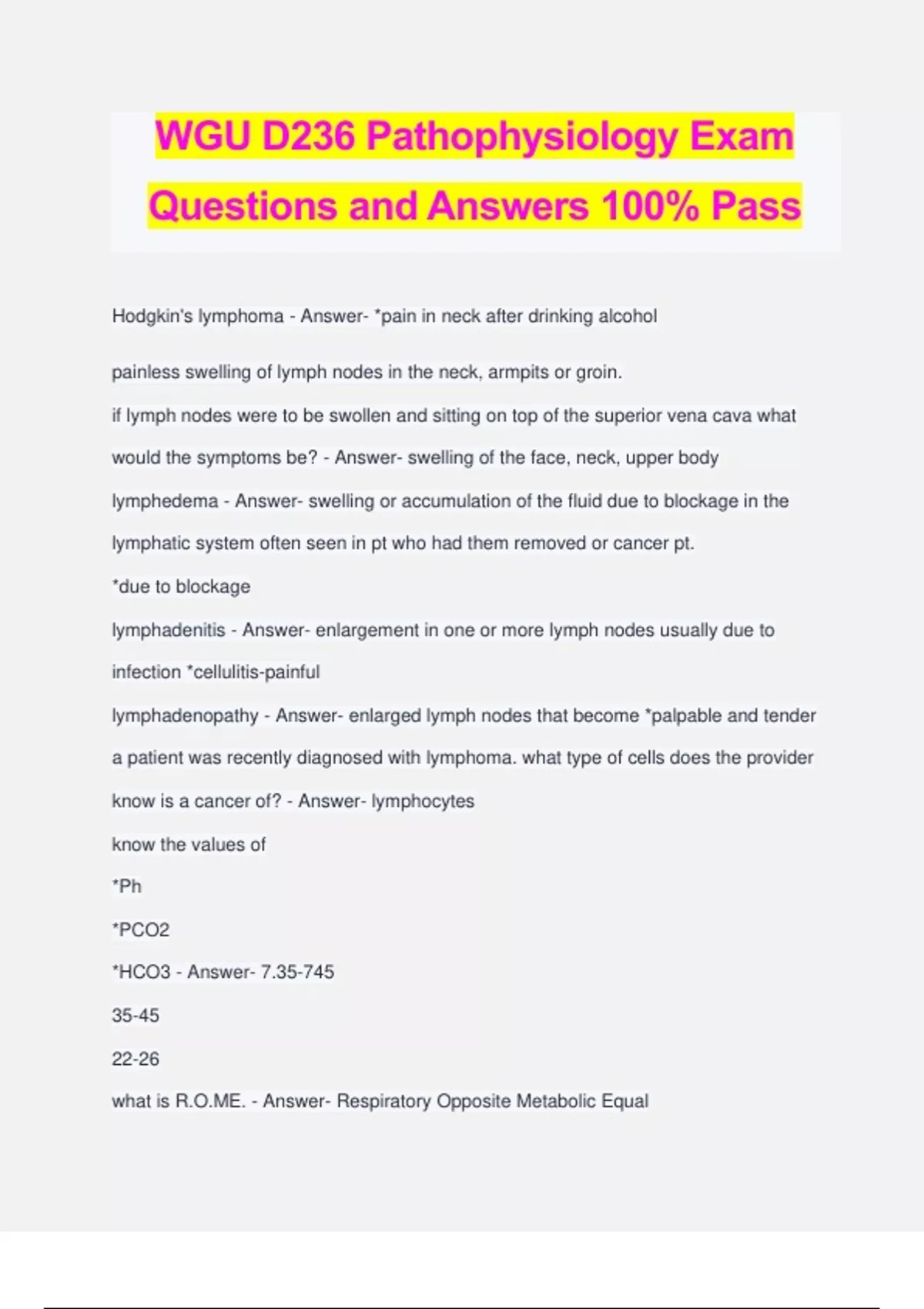 WGU D236 Pathophysiology Exam Questions and Answers 100% Pass Hodgkin's lymphoma - Answer- *pain in neck after drinking alcohol painless swelling of lymph nodes in the neck, armpits or groin. if lymph nodes were to be swollen and sitting on top of the superior vena cava what would the symptoms be? - Answer- swelling of the face, neck, upper body lymphedema - Answer- swelling or accumulation of the fluid due to blockage in the lymphatic system often seen in pt who had them removed or cancer pt. *due to blockage lymphadenitis - Answer- enlargement in one or more lymph nodes usually due to infection *cellulitis-painful lymphadenopathy - Answer- enlarged lymph nodes that become *palpable and tender a patient was recently diagnosed with lymphoma. what type of cells does the provider know is a cancer of? - Answer- lymphocytes know the values of *Ph *PCO2 *HCO3 - Answer- 7.35-745 35-45 22-26 what is R.O.ME. - Answer- Respiratory Opposite Metabolic Equal pressure that is due to albumin in the bloodstream - Answer- oncotic difference between children and adult immunity - Answer- Native T Cells respiratory acidosis causes - Answer- CO2 high PH low CNS depression COPD *hypoventilation respiratory acidosis treatment - Answer- improve ventilation (intubation) admin bicarb respiratory alkalosis causes - Answer- CO2 low, PH high hyperventilation hypoxemia respiratory alkalosis treatment - Answer- CO2 rebreather mask metabolic acidosis causes - Answer- PH Low, due to HCO3 low <22 *DKA, severe diarrhea, renal failure, shock metabolic acidosis treatment - Answer- sodium bicarb metabolic alkalosis causes - Answer- PH high due to HCO3 high >26 excessive vomiting metabolic alkalosis treatment - Answer- electrolyte and fluid replacement *administer vomiting meds what happens to dehydrated pts? - Answer- ADH levels are high and RAAS is activated dehydration /fluid deficit s/s - Answer- *headache, dizziness, weakness, confusion, bad breath, dry mouth, dark urine hypoventilation - Answer- the body's carbon dioxide level rises causing the build up of acid and too little oxygen. *respiratory acidosis *equilibrium shift to right *HCO3 high *PH low hyperventilation - Answer- exhale too much carbon dioxide as a result carbon dioxide concentration in the blood is reduced and bicarb acid equilibrium shifts to the left *respiratory alkalosis *HCO3 low *PH high Hemodyalysis - Answer- takes blood out of the body via a PIV and puts it back into the body through a central line *4-6 hours a few times per week *artificial Kidney CRRT - Answer- cleanses blood in a 24 hour cycle peritoneal dialysis - Answer- does not use a machine but injects a solution of water and glucose into the abdominal cavity Sodium normal levels - Answer- 135-145 mmol/L Hyponatremia <135 Manifestations - Answer- *goes to Brain and Mus