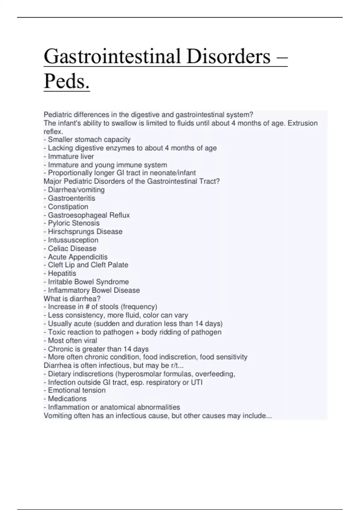 - Hepatitis - Irritable Bowel Syndrome - Inflammatory Bowel Disease What is diarrhea? - Increase in # of stools (frequency) - Less consistency, more fluid, color can vary - Usually acute (sudden and duration less than 14 days) - Toxic reaction to pathogen + body ridding of pathogen - Most often viral - Chronic is greater than 14 days - More often chronic condition, food indiscretion, food sensitivity Diarrhea is often infectious, but may be r/t... - Dietary indiscretions (hyperosmolar formulas, overfeeding, - Infection outside GI tract, esp. respiratory or UTI - Emotional tension - Medications - Inflammation or anatomical abnormalities Vomiting often has an infectious cause, but other causes may include...