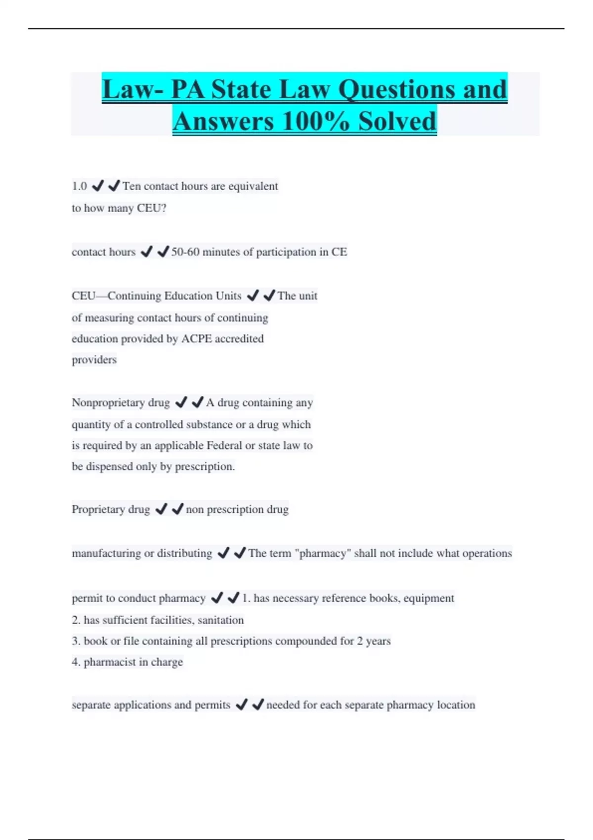 Law- PA State Law Questions and Answers 100% Solved 1.0 ️️Ten contact hours are equivalent to how many CEU? contact hours ️️50-60 minutes of participation in CE CEU—Continuing Education Units ️️The unit of measuring contact hours of continuing education provided by ACPE accredited providers Nonproprietary drug ️️A drug containing any quantity of a controlled substance or a drug which is required by an applicable Federal or state law to be dispensed only by prescription. Proprietary drug ️️non prescription drug
