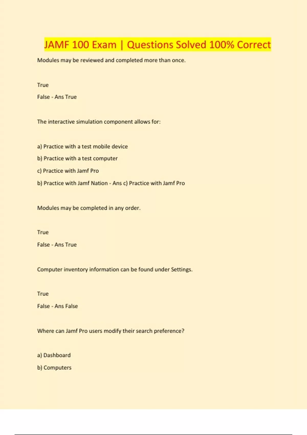 Modules may be reviewed and completed more than once. True False - Ans True The interactive simulation component allows for: a) Practice with a test mobile device b) Practice with a test computer c) Practice with Jamf Pro b) Practice with Jamf Nation - Ans c) Practice with Jamf Pro