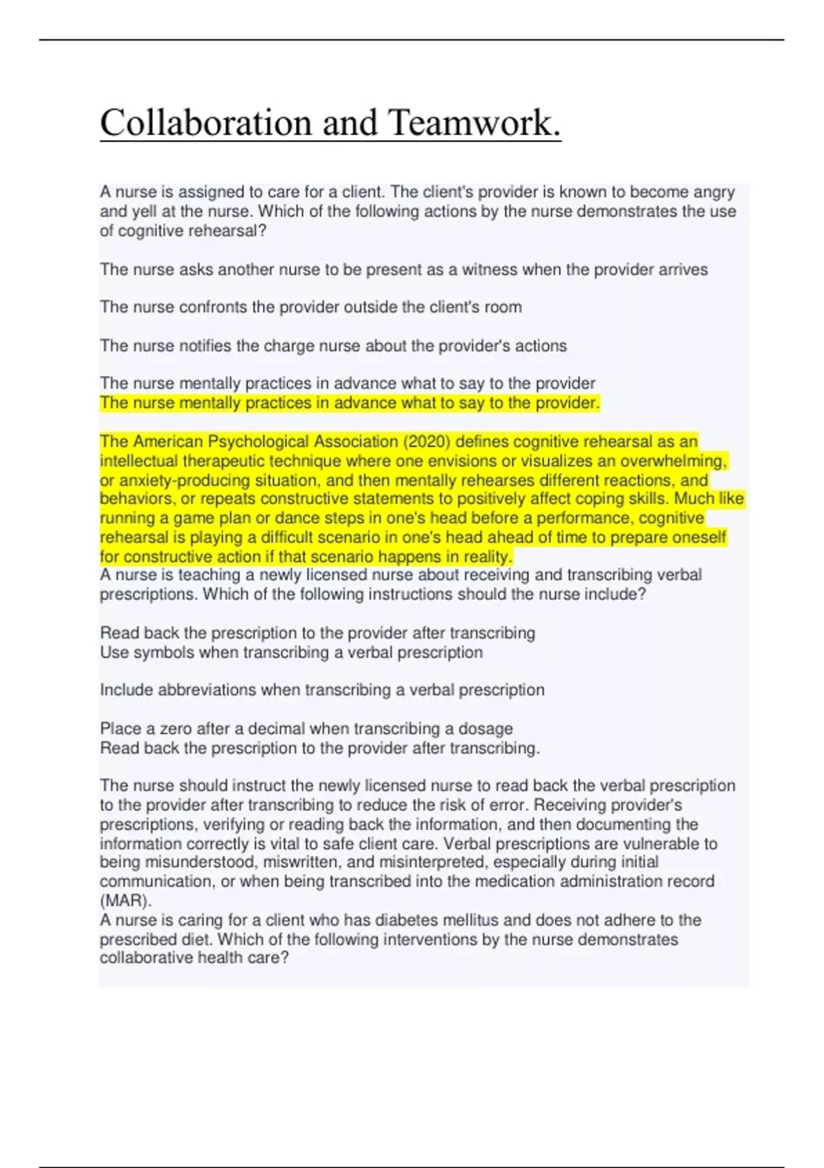 A nurse is teaching a newly licensed nurse about receiving and transcribing verbal prescriptions. Which of the following instructions should the nurse include? Read back the prescription to the provider after transcribing Use symbols when transcribing a verbal prescription Include abbreviations when transcribing a verbal prescription Place a zero after a decimal when transcribing a dosage Read back the prescription to the provider after transcribing. The nurse should instruct the newly licensed nurse to read back the verbal prescription to the provider after transcribing to reduce the risk of error. Receiving provider's prescriptions, verifying or reading back the information, and then documenting the information correctly is vital to safe client care. Verbal prescriptions are vulnerable to being misunderstood, miswritten, and misinterpreted, especially during initial communication, or when being transcribed into the medication administration record (MAR). A nurse is caring for a client who has diabetes mellitus and does not adhere to the prescribed diet. Which of t