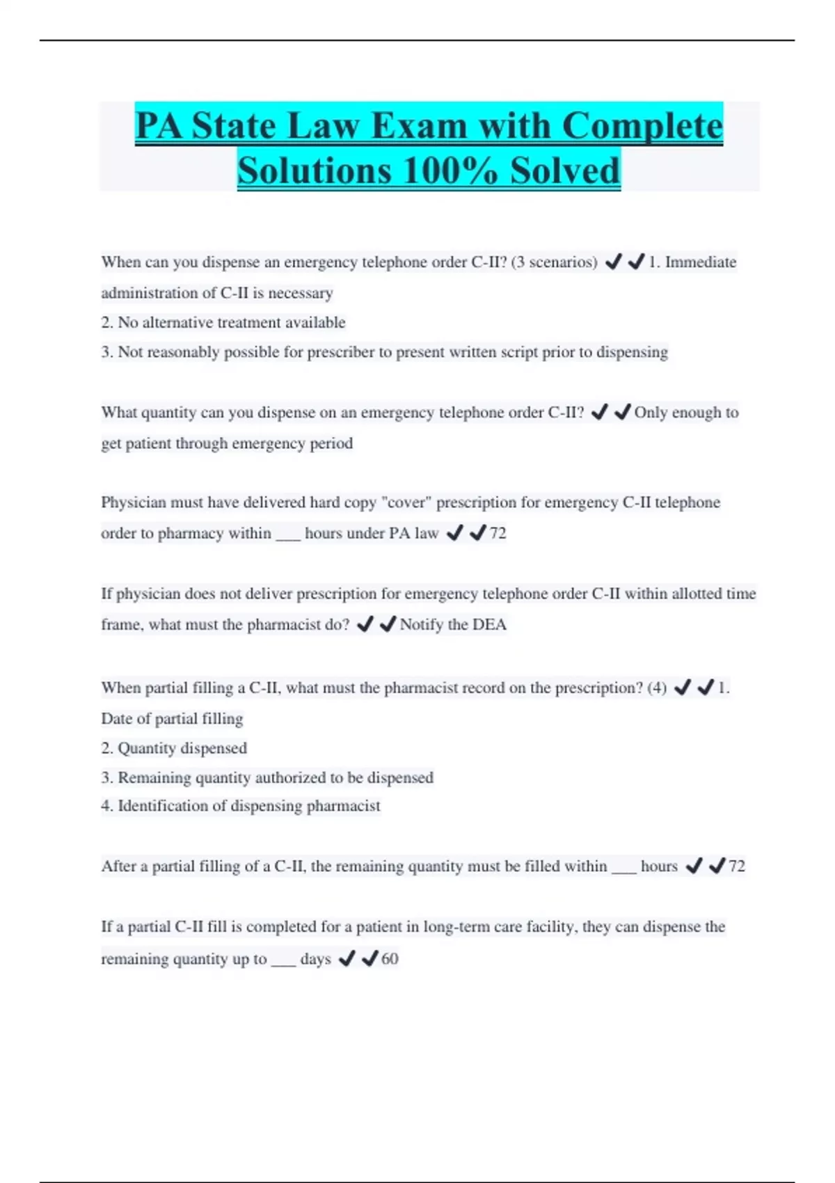 PA State Law Exam with Complete Solutions 100% Solved When can you dispense an emergency telephone order C-II? (3 scenarios) ️️1. Immediate administration of C-II is necessary 2. No alternative treatment available 3. Not reasonably possible for prescriber to present written script prior to dispensing What quantity can you dispense on an emergency telephone order C-II? ️️Only enough to get patient through emergency period Physician must have delivered hard copy "cover" prescription for emergency C-II telephone order to pharmacy within ___ hours under PA law ️️72 If physician does not deliver prescription for emergency telephone order C-II within allotted time frame, what must the pharmacist do? ️️Notify the DEA When partial filling a C-II, what must the pharmacist record on the prescription? (4) ️️1. Date of partial filling 2. Quantity dispensed 3. Remaining quantity authorized to be dispensed 4. Identification of dispensing pharmacist