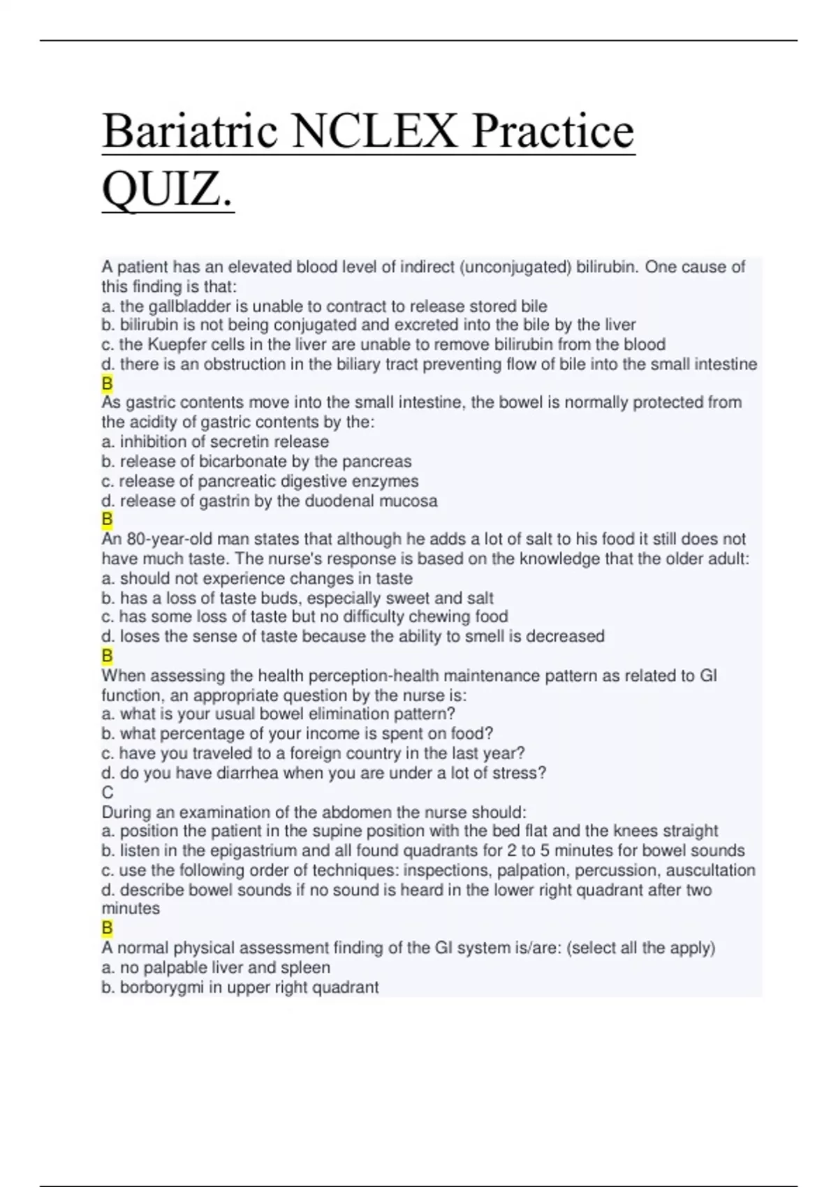 C During an examination of the abdomen the nurse should: a. position the patient in the supine position with the bed flat and the knees straight b. listen in the epigastrium and all found quadrants for 2 to 5 minutes for bowel sounds c. use the following order of techniques: inspections, palpation, percussion, auscultation d. describe bowel sounds if no sound is heard in the lower right quadrant after two minutes B A normal physical assessment finding of the GI system is/are: (select all the apply) a. no palpable liver and spleen b. borborygmi in upper right quadrant c. tympani on percussion of the abdomen d. liver edge 2 to 4 cm below the costal margin e. finding a firm nodular edge on the rectal exam A, C In preparing a patient for a colonoscopy, the nurse explains that: a. a signed permit is not necessary b. sedation may be used during the procedure c. only one cleansing enema is necessary for preparation d. a light meal should be eaten the day before the procedure B The percentage of daily calories for a healthy individual consists of: a. 50% carbohydrates, 25% protein, 25% fat, and <10% of fat from saturated fatty acids b. 65% carbohydrates, 25% protein, 25% fat, and >10% of fat from saturated fatty acids c. 50% carbohydrates, 40% protein, 10% fat, and <10% of fat from saturated fatty acids d. 40% carbohydrates, 30% protein, 30% fat, and >10% of fat from saturated fatty acids A Which of the following statements best described the etiology of obesity: a. obesity primarily results from a genetic predisposition b. psychosocial factors can override the effects of genetics in the etiology of obesity c. Obesity is the result of complex interactions between genetic and environmental factors d. genetic factors are more important than environmental factors in the etiology of obesity