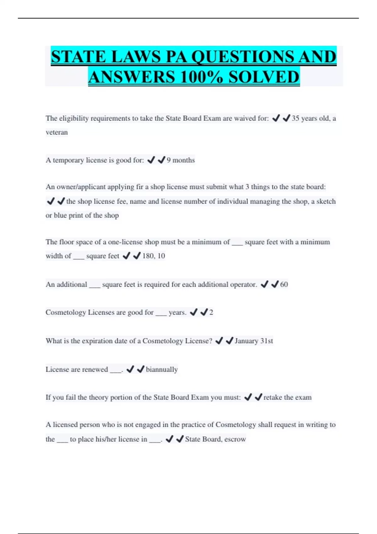 PA State Laws Questions and Answers 100% Solved When does your real estate license expire in Pennsylvania? ️️May 31 of every even numbered year Larry, a Pennsylvania broker, provided a copy of the Consumer Notice to a prospective buyer prior to entering into an agency relationship and showing the buyer several properties. How long must he retain a copy of the notice? ️️at least 6 months Under Pennsylvania law, which of these items would a licensee need to disclose to any consumers? A)A buyer is willing to offer more than list price. B)A seller is willing to accept lower than list price. C)The licensee has a personal or financial conflict of interest. D)The property has material defects. ️️C- the licensee has a personal or financial conflict of interest Edward, a Pennsylvania broker, is going through transaction files from one year ago. Which of the following items can be disposed of? ️️consumer notice Which of the following actions would be appropriate for a Pennsylvania licensee to engage in with a consumer the licensee does not represent? A)Advertisement of property for sale B)Providing legal advice. C)Suggesting terms for an offer or counter-offer