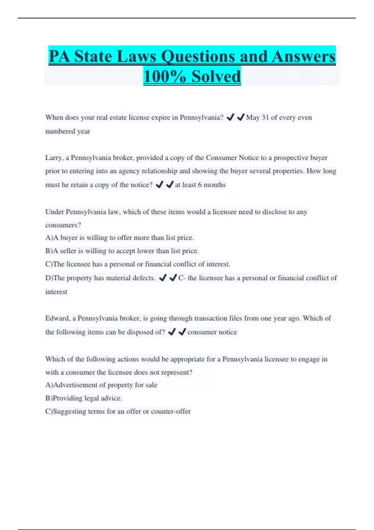 PA State Laws Questions and Answers 100% Solved When does your real estate license expire in Pennsylvania? ️️May 31 of every even numbered year Larry, a Pennsylvania broker, provided a copy of the Consumer Notice to a prospective buyer prior to entering into an agency relationship and showing the buyer several properties. How long must he retain a copy of the notice? ️️at least 6 months Under Pennsylvania law, which of these items would a licensee need to disclose to any consumers? A)A buyer is willing to offer more than list price. B)A seller is willing to accept lower than list price. C)The licensee has a personal or financial conflict of interest. D)The property has material defects. ️️C- the licensee has a personal or financial conflict of interest Edward, a Pennsylvania broker, is going through transaction files from one year ago. Which of the following items can be disposed of? ️️consumer notice Which of the following actions would be appropriate for a Pennsylvania licensee to engage in with a consumer the licensee does not represent? A)Advertisement of property for sale B)Providing legal advice. C)Suggesting terms for an offer or counter-offer
