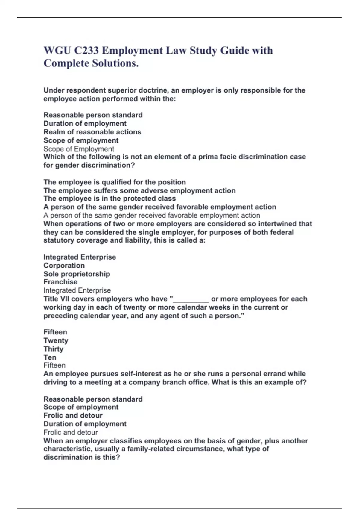 WGU C233 Employment Law Study Guide with Complete Solutions. Under respondent superior doctrine, an employer is only responsible for the employee action performed within the: Reasonable person standard Duration of employment Realm of reasonable actions Scope of employment Scope of Employment Which of the following is not an element of a prima facie discrimination case for gender discrimination? The employee is qualified for the position The employee suffers some adverse employment action The employee is in the protected class A person of the same gender received favorable employment action A person of the same gender received favorable employment action When operations of two or more employers are considered so intertwined that they can be considered the single employer, for purposes of both federal statutory coverage and liability, this is called a: Integrated Enterprise Corporation Sole proprietorship Franchise Integrated Enterprise Title VII covers employers who have "_________ or more employees for each working day in each of twenty or more calendar weeks in the current or preceding calendar year, and any agent of such a person." Fifteen Twenty Thirty Ten Fifteen An employee pursues self-interest as he or she runs a personal errand while driving to a meeting at a company branch office. What is this an example of? Reasonable person standard Scope of employment Frolic and detour Duration of employment Frolic and detour When an employer classifies employees on the basis of gender, plus another characteristic, usually a family-related circumstance, what type of discrimination is this?