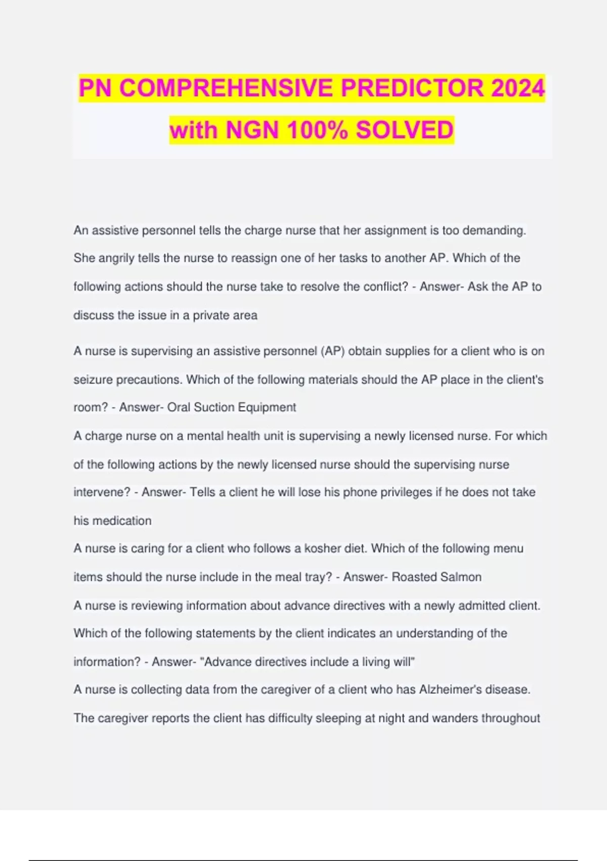 PN COMPREHENSIVE PREDICTOR 2024 with NGN 100% SOLVED An assistive personnel tells the charge nurse that her assignment is too demanding. She angrily tells the nurse to reassign one of her tasks to another AP. Which of the following actions should the nurse take to resolve the conflict? - Answer- Ask the AP to discuss the issue in a private area A nurse is supervising an assistive personnel (AP) obtain supplies for a client who is on seizure precautions. Which of the following materials should the AP place in the client's room? - Answer- Oral Suction Equipment A charge nurse on a mental health unit is supervising a newly licensed nurse. For which of the following actions by the newly licensed nurse should the supervising nurse intervene? - Answer- Tells a client he will lose his phone privileges if he does not take his medication A nurse is caring for a client who follows a kosher diet. Which of the following menu items should the nurse include in the meal tray? - Answer- Roasted Salmon A nurse is reviewing information about advance directives with a newly admitted client. Which of the following statements by the client indicates an understanding of the information? - Answer- "Advance directives include a living will" A nurse is collecting data from the caregiver of a client who has Alzheimer's disease. The caregiver reports the client has difficulty sleeping at night and wanders throughout the house. Which of the following interventions should the nurse recommend? - Answer- Encourage the client to take frequent walks during the day A nurse is assisting in the care of a client who is 8hr postpartum and has uterine atony with increased bleeding. Which of the following actions should the nurse take? (Select all that apply) - Answer- Assist the client to empty her bladder A nurse is reinforcing teaching with the support person of a client who is in the first stage of labor. Which of the following instructions should the nurse include regarding effleurage? - Answer- "Gently stroke her abdomen during contractions" A nurse is caring for an older adult client who is postoperative following a total hip arthroplasty. The client is incontinent of stool and urine. Which of the following actions should the nurse take to prevent skin breakdown? - Answer- Use a moisture barrier on the client's skin A nurse is caring for a client who has terminal cancer. Which of the following actions should the nurse take to promote the client's autonomy? - Answer- Allow the client to choose treatment times A nurse in a clinic is caring for a client who is at 40 weeks of gestation and experiences a sudden gush of vaginal fluids. Which of the following findings is evidence of an obstetric complication? - Answer- Appears greenish-brown in color A nurse is assisting with the care of an adolescent client immediately following a lumbar puncture. Which of the following actions should the nurse take? - Answer- Inform the adolescent that he might experience a headache A nurse is reinforcing teaching about advance directives with a client who has end- stage heart failure. Which of the following statements by the client indicates an understanding of the teaching? - Answer- "I should discuss this document with my family after I sign it" A nurse is caring for a client who has continuous bladder irrigation following a transurethral resection of the prostate. The nurse notices clots and dark red blood in the catheter collection bag. Which of the following actions should the nurse take? - Answer- Irrigate the bladder with 20 to 30 mL of 0.9% sodium chloride A nurse is planning to obtain a 12-lead ECG for a client who has a history of cardiac dysrhythmias. Which of the following actions should the nurse plan to take? - Answer- Instruct the client to remain as still as possible during the recording A nurse is reinforcing teaching with a client who has genital herpes. Which of the following information should the nurse include in the teaching? - Answer- "You should increase fluid intake to relieve dysuria" A nurse is preparing to empty a postoperative client's closed-wound drainage system. Which of the following actions should the nurse plan to take? - Answer- Compress the container before replacing the drainage plug A nurse is reinforcing teaching with the parents of a toddler who has a new diagnosis of asthma and a prescription for montelukast. Which of the following instructions should the nurse include in the teaching? - Answer- Administer the medication to the toddler each evening A nurse in an acute mental health facility is caring for a newly admitted client. Which of the following should occur during the orientation phase of the nurse-client relationship? - Answer- Defining responsibilities A nurse is caring for a client who reports having a decrease in fetal movement following an external cephalic version 6 hr ago. The nurse identifies the fetus is in the right occiput anterior position. The nurse should place the fetal heart monitor on which of the following sites to auscultate the fetal heart rate? - Answer- Lower left A charge nurse is observing a newly licensed nurse perform suctioning for a client who has a tracheostomy. For which of the following actions by the newly licensed nurse should the charge nurse intervene? - Answer- Suction for 30 seconds A nurse is reviewing the medication administration record of a client who takes atenolol PO and supplies a nitroglycerin transdermal patch daily. Which of the following interactions should the nurse monitor with this client? - Answer- Hypotension A nurse in an acute care setting is preparing to administer medications to a client. Which of the following actions should the nurse verify the client's identity? - Answer- Verify the client's identity using a photograph A nurse in a provider's office is collecting data from a client who has psoriasis. Which of the following statements made by the client should she report to the provider? - Answer- "I try not to look at the scales on m