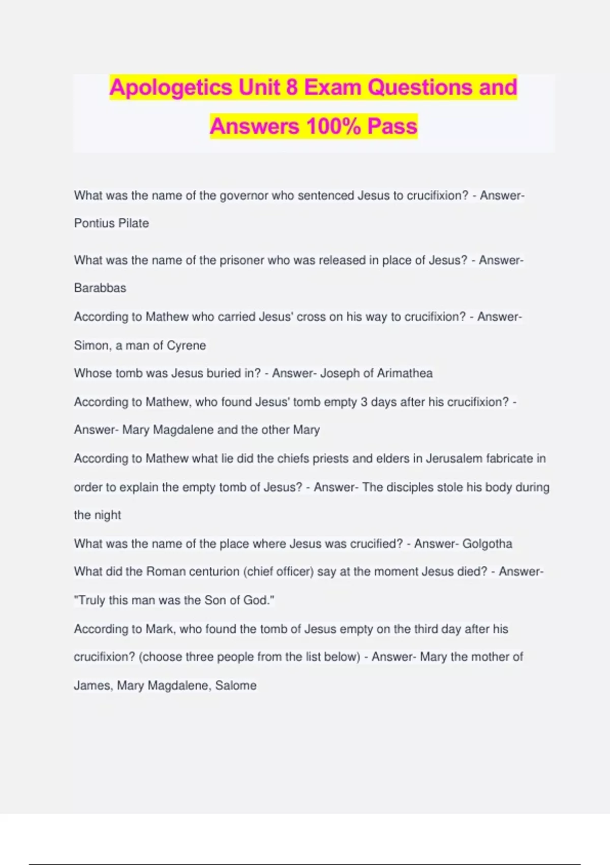 Apologetics Unit 8 Exam Questions and Answers 100% Pass What was the name of the governor who sentenced Jesus to crucifixion? - Answer- Pontius Pilate What was the name of the prisoner who was released in place of Jesus? - Answer- Barabbas According to Mathew who carried Jesus' cross on his way to crucifixion? - Answer- Simon, a man of Cyrene Whose tomb was Jesus buried in? - Answer- Joseph of Arimathea According to Mathew, who found Jesus' tomb empty 3 days after his crucifixion? - Answer- Mary Magdalene and the other Mary According to Mathew what lie did the chiefs priests and elders in Jerusalem fabricate in order to explain the empty tomb of Jesus? - Answer- The disciples stole his body during the night What was the name of the place where Jesus was crucified? - Answer- Golgotha What did the Roman centurion (chief officer) say at the moment Jesus died? - Answer- "Truly this man was the Son of God." According to Mark, who found the tomb of Jesus empty on the third day after his crucifixion? (choose three people from the list below) - Answer- Mary the mother of James, Mary Magdalene, Salome What command did Jesus give his followers prior to his ascension to heaven? - Answer- "Go into all the world and proclaim the gospel to the whole creation." Which one of Jesus' disciples betrayed him with a kiss? - Answer- Judas Which one of Jesus' disciples denied him three times prior to his death? - Answer- Peter When Pontius Pilate addressed the crowd in Jerusalem and asked them what he should do with Jesus, what did they say? - Answer- Crucify him What did the two angels say to the women when they went to Jesus' empty tomb three days after his crucifixion? - Answer- "Why do you seek the living among the dead? He is not here, but has risen." What did Jesus say to the disciples when he appeared to them after his resurrection and they thought he was a spirit? - Answer- "See my hands and my feet, that it is I myself. Touch me, and see." When the crowds demanded that Pontius Pilate crucify Jesus, what did Pilate initially say? - Answer- "Take him yourselves and crucify him, for I find no guilt in him." According to John, what is the last thing that Jesus said on the cross before he died? - Answer- It is finished According to John, who assisted Joseph of Arimathea with the burial of Jesus? - Answer- Nicodemus According to John, after Mary Magdalene found the tomb of Jesus empty three days after his crucifixion, who did she immediately run to tell first? - Answer- Simon Peter and the disciple whom Jesus loved After Jesus' resurrection, which disciple made the following statement? "Unless I see in his hands the mark of the nails, and place my finger into the mark of the nails, and place my hand into his side, I will never believe." - Answer- Thomas According to 1 Corinthians 15:14-17, if Christ has not been raised from the dead... - Answer- Faith in Christ is in vain, Preaching about Christ is in vain, God is misrepresented, Christians are still in their sins. What if it can be proven that Jesus didn't rise from the dead? - Answer- Everything Jesus said and did is a lie. Christianity is false We shouldn't pay attention to anything Jesus said. Jesus is a fraud. What if it can be proven that Jesus did rise from the dead? (Hint: Choose four answers) - Answer- Everything Jesus said and did is validated. We have to pay attention to everything Jesus said, Christianity is true, Jesus is Lord If Jesus rose from the dead, then he is Lord, which means he has absolute authority over... - Answer- all things, all people, life and death sin and Satan According to Romans 10:9-10, what does a person have to do in order to be "saved"? - Answer- Believe that God raised Jesus from the dead
