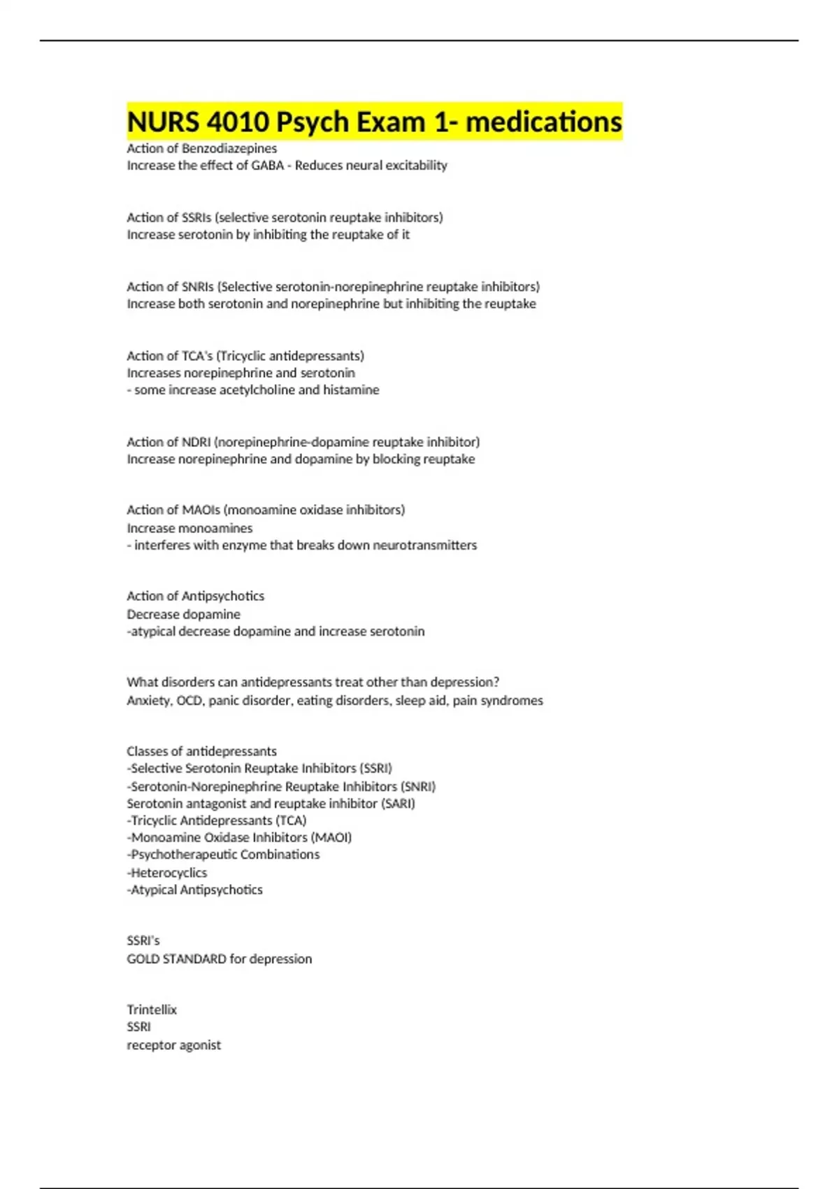 NURS 4010 Psych Exam 1- medications Action of Benzodiazepines Increase the effect of GABA - Reduces neural excitability Action of SSRIs (selective serotonin reuptake inhibitors) Increase serotonin by inhibiting the reuptake of it Action of SNRIs (Selective serotonin-norepinephrine reuptake inhibitors) Increase both serotonin and norepinephrine but inhibiting the reuptake Action of TCA's (Tricyclic antidepressants) Increases norepinephrine and serotonin - some increase acetylcholine and histamine Action of NDRI (norepinephrine-dopamine reuptake inhibitor) Increase norepinephrine and dopamine by blocking reuptake Action of MAOIs (monoamine oxidase inhibitors) Increase monoamines - interferes with enzyme that breaks down neurotransmitters Action of Antipsychotics Decrease dopamine -atypical decrease dopamine and increase serotonin What disorders can antidepressants treat other than depression? Anxiety, OCD, panic disorder, eating disorders, sleep aid, pain syndromes Classes of antidepressants -Selective Serotonin Reuptake Inhibitors (SSRI) -Serotonin-Norepinephrine Reuptake Inhibitors (SNRI) Serotonin antagonist and reuptake inhibitor (SARI) -Tricyclic Antidepressants (TCA) -Monoamine Oxidase Inhibitors (MAOI) -Psychotherapeutic Combinations -Heterocyclics -Atypical Antipsychotics SSRI's GOLD STANDARD for depression Trintellix SSRI receptor agonist