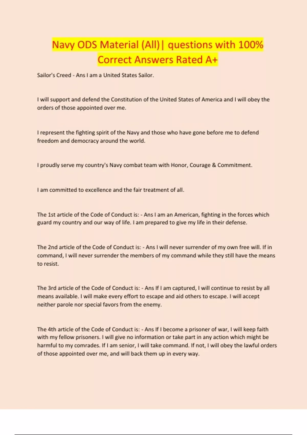 Navy ODS Material (All)| questions with 100% Correct Answers Rated A+