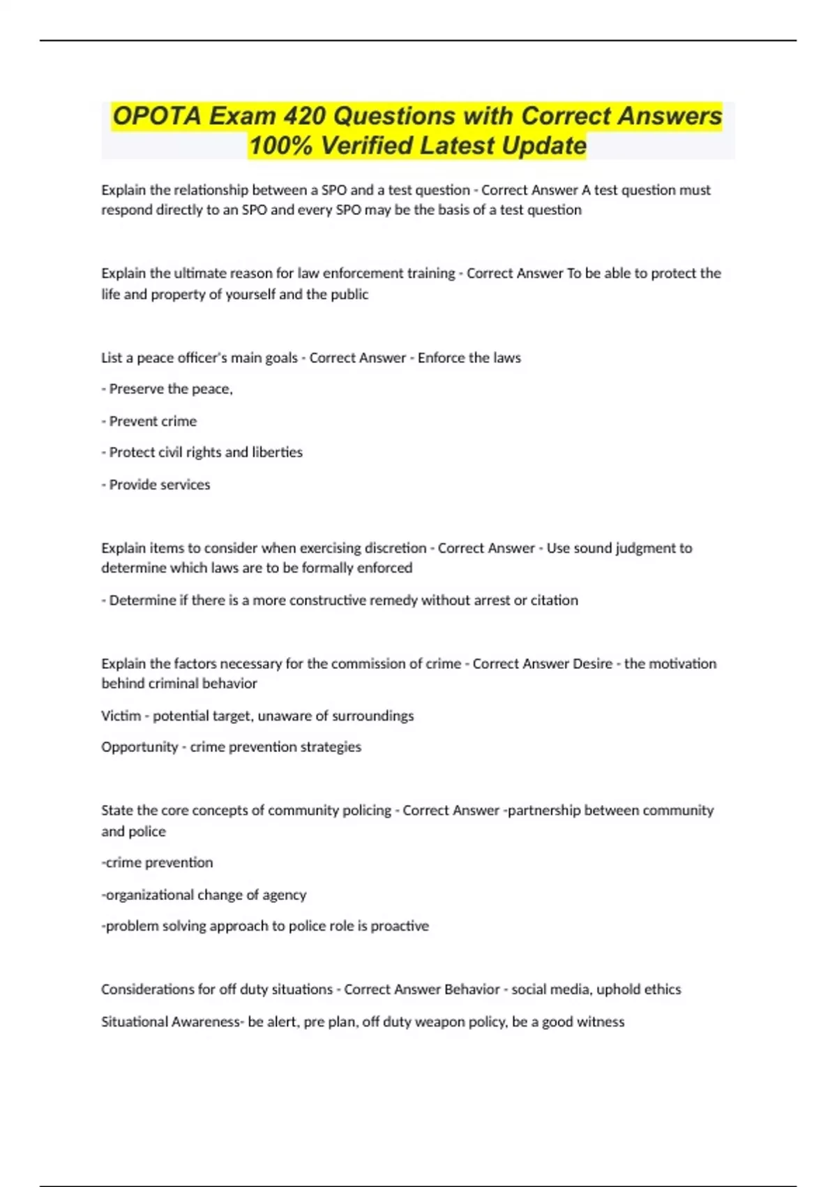 OPOTA Exam 420 Questions with Correct Answers 100% Verified Latest Update Explain the relationship between a SPO and a test question - Correct Answer A test question must respond directly to an SPO and every SPO may be the basis of a test question Explain the ultimate reason for law enforcement training - Correct Answer To be able to protect the life and property of yourself and the public List a peace officer's main goals - Correct Answer - Enforce the laws - Preserve the peace, - Prevent crime - Protect civil rights and liberties - Provide services Explain items to consider when exercising discretion - Correct Answer - Use sound judgment to determine which laws are to be formally enforced - Determine if there is a more constructive remedy without arrest or citation Explain the factors necessary for the commission of crime - Correct Answer Desire - the motivation behind criminal behavior Victim - potential target, unaware of surroundings Opportunity - crime prevention strategies State the core concepts of community policing - Correct Answer -partnership between community and police -crime prevention -organizational change of agency -problem solving approach to police role is proactive Considerations for off duty situations - Correct Answer Behavior - social media, uphold ethics Situational Awareness- be alert, pre plan, off duty weapon policy, be a good witness State the purpose of Bill of Rights - Correct Answer protect a individual's freedoms -prevent g