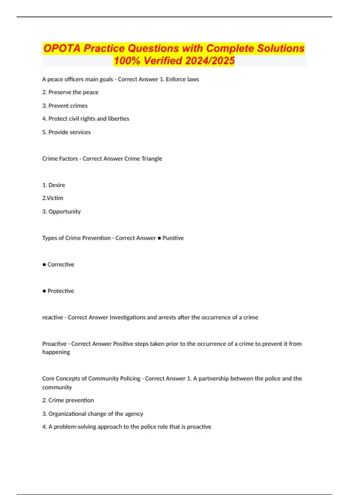 OPOTA Practice Questions with Complete Solutions 100% Verified 2024/2025 A peace officers main goals - Correct Answer 1. Enforce laws 2. Preserve the peace 3. Prevent crimes 4. Protect civil rights and liberties 5. Provide services Crime Factors - Correct Answer Crime Triangle 1. Desire 2.Victim 3. Opportunity Types of Crime Prevention - Correct Answer ● Punitive ● Corrective ● Protective reactive - Correct Answer Investigations and arrests after the occurrence of a crime Proactive - Correct Answer Positive steps taken prior to the occurrence of a crime to prevent it from happening Core Concepts of Community Policing - Correct Answer 1. A partnership between the police and the community 2. Crime prevention 3. Organizational change of the agency 4. A problem-solving approach to the police role that is proactive SARA model - Correct Answer Scanning Analysis Response Assessment