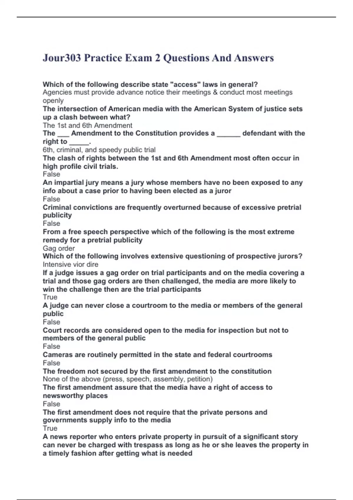 Jour303 Practice Exam 2 Questions And Answers Which of the following describe state "access" laws in general? Agencies must provide advance notice their meetings & conduct most meetings openly The intersection of American media with the American System of justice sets up a clash between what? The 1st and 6th Amendment The ___ Amendment to the Constitution provides a ______ defendant with the right to _____. 6th, criminal, and speedy public trial The clash of rights between the 1st and 6th Amendment most often occur in high profile civil trials. False An impartial jury means a jury whose members have no been exposed to any info about a case prior to having been elected as a juror False Criminal convictions are frequently overturned because of excessive pretrial publicity False From a free speech perspective which of the following is the most extreme remedy for a pretrial publicity Gag order Which of the following involves extensive questioning of prospective jurors? Intensive vior dire If a judge issues a gag order on trial participants and on the media covering a trial and those gag orders are then challenged, the media are more likely to win the challenge then are the trial participants True A judge can never close a courtroom to the media or members of the general public False Court records are considered open to the media for inspection but not to members of the general public False Cameras are routinely permitted in the state and federal courtrooms False The freedom not secured by the first amendment to the constitution None of the above (press, speech, assembly, petition) The first amendment assure that the media have a right of access to newsworthy places False The first amendment does not require that the private persons and governments supply info to the media True A news reporter who enters private property in pursuit of a significant story can never be charged with trespass as long as he or she leaves the property in a timely fashion after getting what is needed