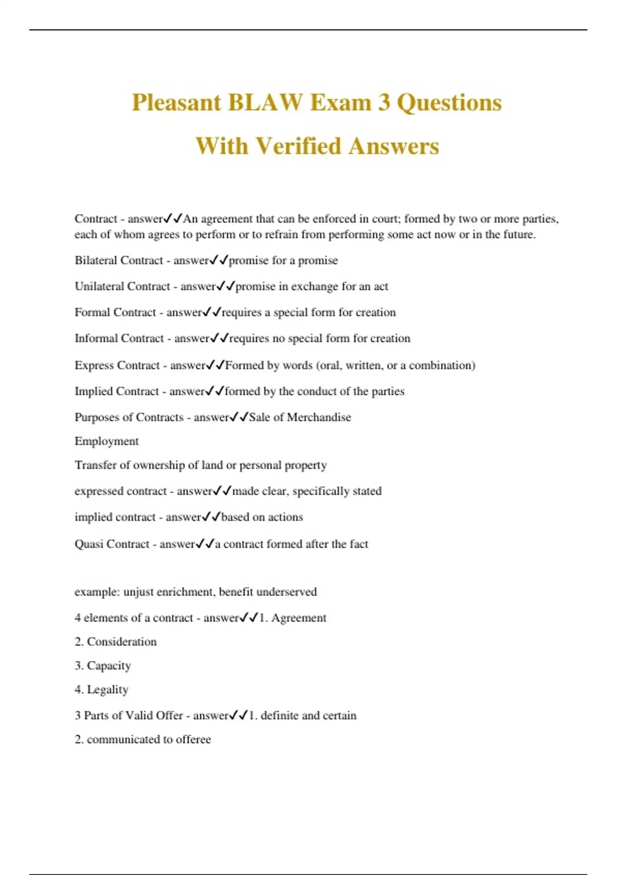 Pleasant BLAW Exam 3 Questions With Verified Answers Contract - answerAn agreement that can be enforced in court; formed by two or more parties, each of whom agrees to perform or to refrain from performing some act now or in the future. Bilateral Contract - answerpromise for a promise Unilateral Contract - answerpromise in exchange for an act Formal Contract - answerrequires a special form for creation Informal Contract - answerrequires no special form for creation Express Contract - answerFormed by words (oral, written, or a combination) Implied Contract - answerformed by the conduct of the parties Purposes of Contracts - answerSale of Merchandise Employment Transfer of ownership of land or personal property expressed contract - answermade clear, specifically stated implied contract - answerbased on actions Quasi Contract - answera contract formed after the fact example: unjust enrichment, benefit underserved 4 elements of a contract - answer1. Agreement 2. Consideration 3. Capacity 4. Legality 3 Parts of Valid Offer - answer1. definite and certain 2. communicated to offeree