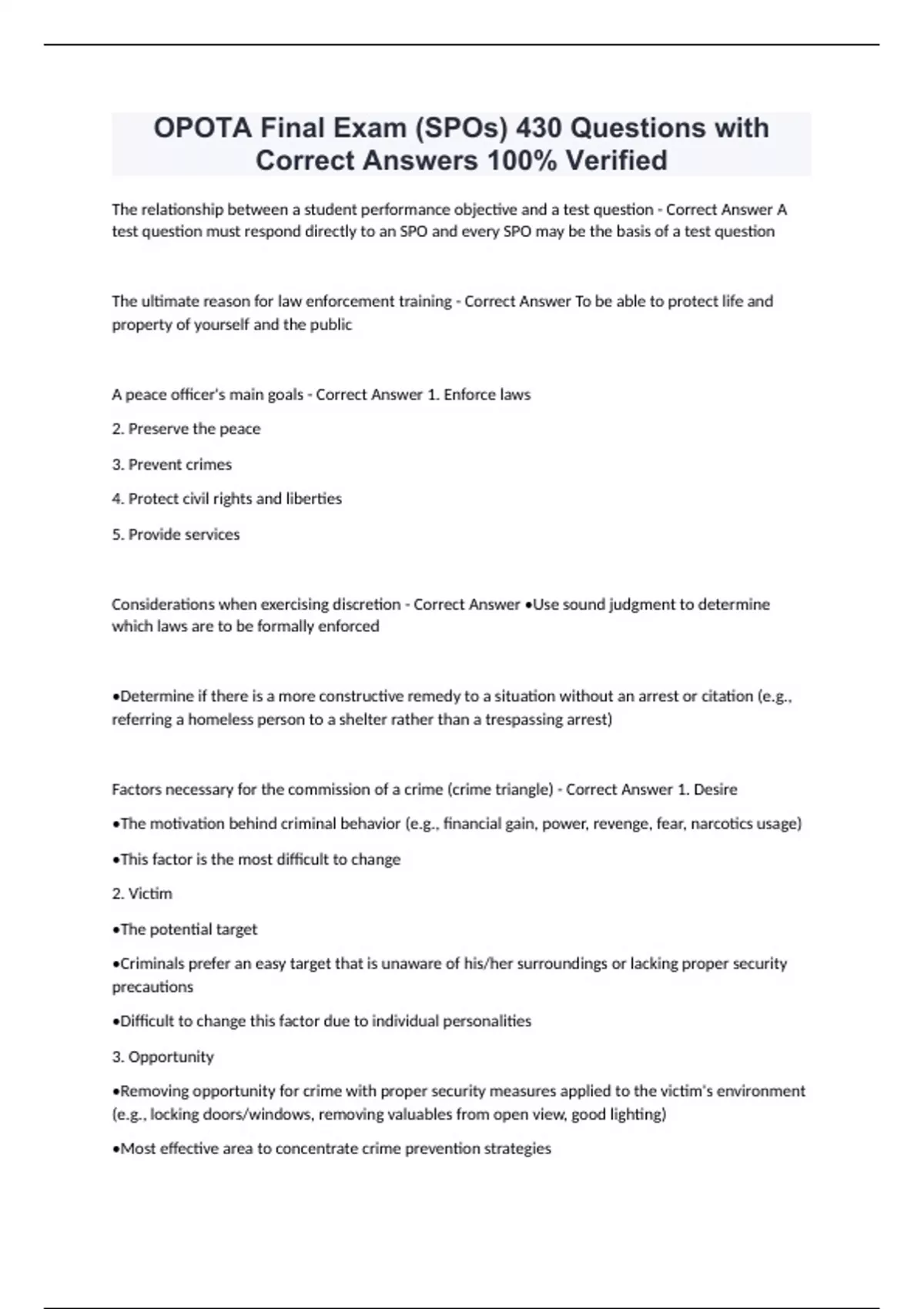 OPOTA Final Exam (SPOs) 430 Questions with Correct Answers 100% Verified The relationship between a student performance objective and a test question - Correct Answer A test question must respond directly to an SPO and every SPO may be the basis of a test question The ultimate reason for law enforcement training - Correct Answer To be able to protect life and property of yourself and the public A peace officer's main goals - Correct Answer 1. Enforce laws 2. Preserve the peace 3. Prevent crimes 4. Protect civil rights and liberties 5. Provide services Considerations when exercising discretion - Correct Answer •Use sound judgment to determine which laws are to be formally enforced •Determine if there is a more constructive remedy to a situation without an arrest or citation (e.g., referring a homeless person to a shelter rather than a trespassing arrest) Factors necessary for the commission of a crime (crime triangle) - Correct Answer 1. Desire •The motivation behind criminal behavior (e.g., financial gain, power, revenge, fear, narcotics usage) •This factor is the most difficult to change 2. Victim •The potential target •Criminals prefer an easy target that is unaware of his/her surroundings or lacking proper security precautions •Difficult to change this factor due to individual personalities 3. Opportunity •Removing opportunity for crime with proper security measures applied to the victim's environment (e.g., locking doors/windows, removing valuables from open view, good lighting) •Most effective area to concentrate crime prevention strategies Core concepts of community policing - Correct Answer - a partnership between the police and the community - crime prevention - organizational change of the agency - a problem- solving approach to the police role that is proactive