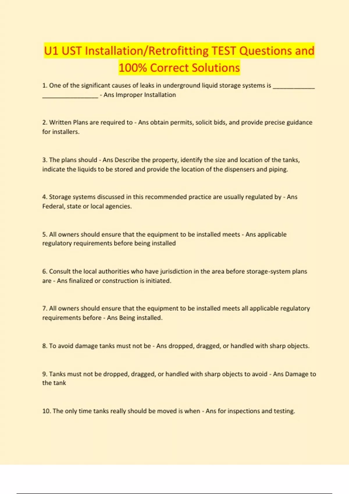 . One of the significant causes of leaks in underground liquid storage systems is ____________ ________________ - Ans Improper Installation 2. Written Plans are required to - Ans obtain permits, solicit bids, and provide precise guidance for installers. 3. The plans should - Ans Describe the property, identify the size and location of the tanks, indicate the liquids to be stored and provide the location of the dispensers and piping.
