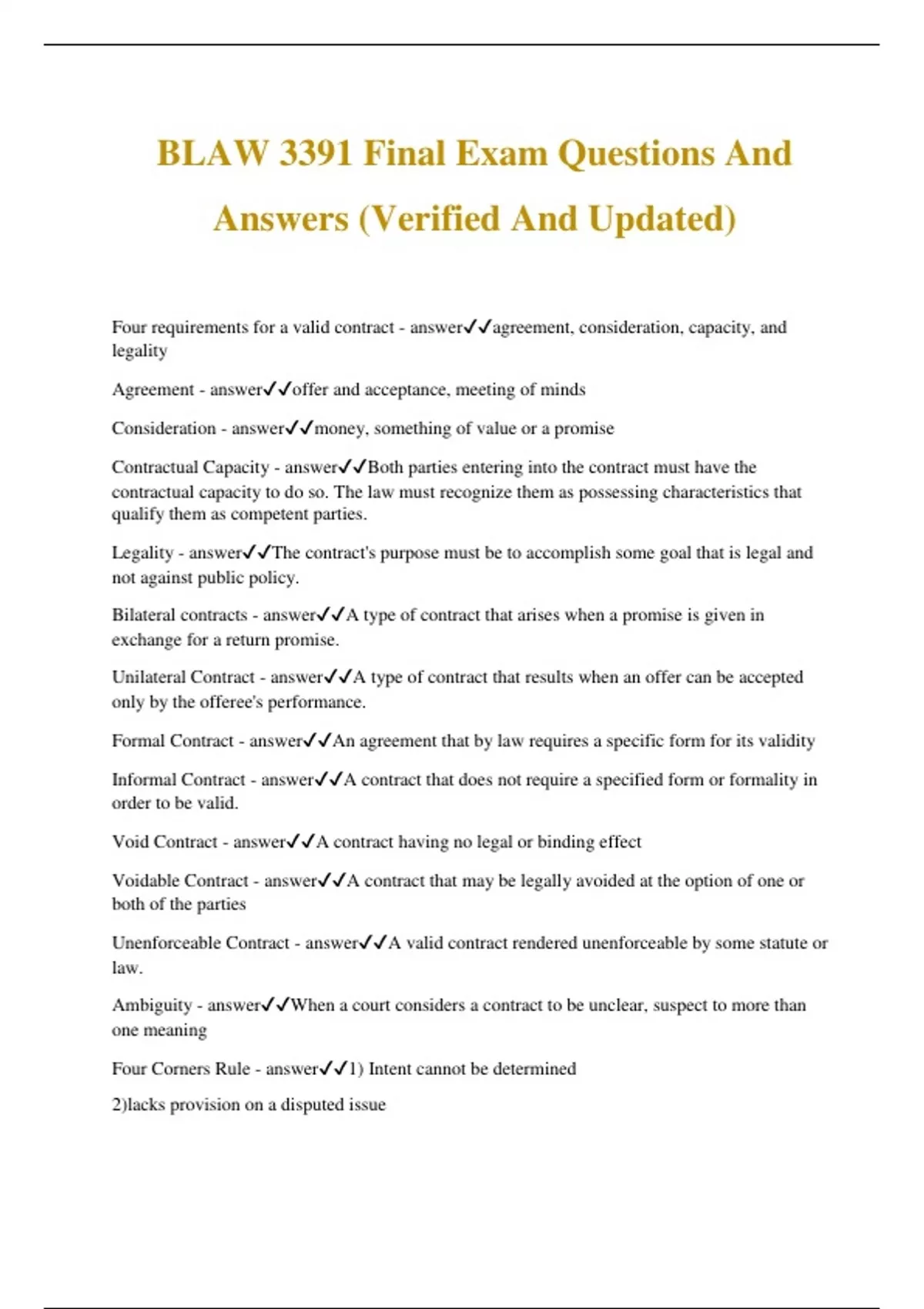 BLAW 3391 Final Exam Questions And Answers (Verified And Updated) Four requirements for a valid contract - answeragreement, consideration, capacity, and legality Agreement - answeroffer and acceptance, meeting of minds Consideration - answermoney, something of value or a promise Contractual Capacity - answerBoth parties entering into the contract must have the contractual capacity to do so. The law must recognize them as possessing characteristics that qualify them as competent parties. Legality - answerThe contract's purpose must be to accomplish some goal that is legal and not against public policy. Bilateral contracts - answerA type of contract that arises when a promise is given in exchange for a return promise. Unilateral Contract - answerA type of contract that results when an offer can be accepted only by the offeree's performance. Formal Contract - answerAn agreement that by law requires a specific form for its validity Informal Contract - answerA contract that does not require a specified form or formality in order to be valid. Void Contract - answerA contract having no legal or binding effect Voidable Contract - answerA contract that may be legally avoided at the option of one or both of the parties Unenforceable Contract - answerA valid contract rendered unenforceable by some statute or law. Ambiguity - answerWhen a court considers a contract to be unclear, suspect to more than one meaning Four Corners Rule - answer1) Intent cannot be determined 2)lacks provision on a disputed issue
