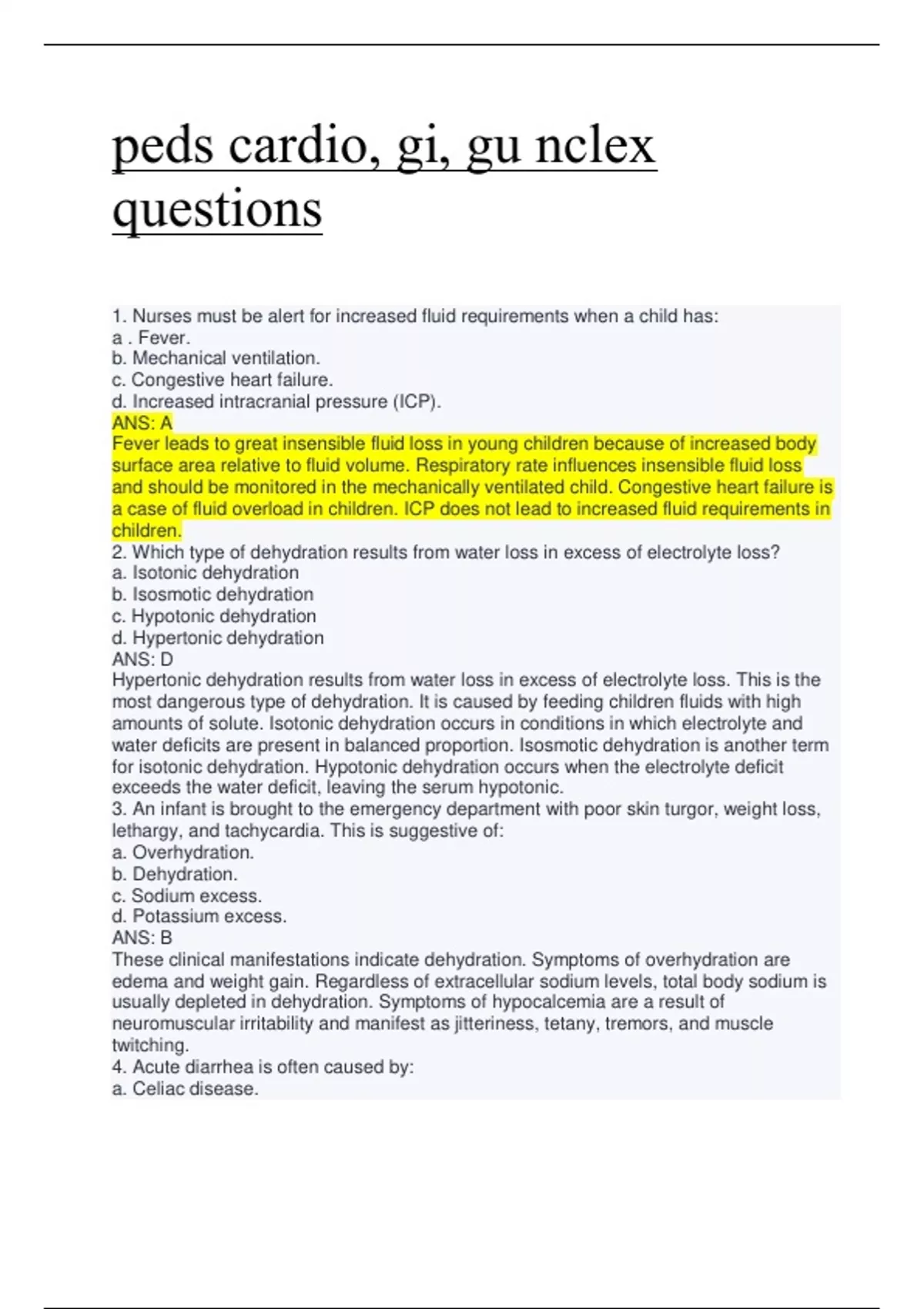 1. Nurses must be alert for increased fluid requirements when a child has: a . Fever. b. Mechanical ventilation. c. Congestive heart failure. d. Increased intracranial pressure (ICP). ANS: A Fever leads to great insensible fluid loss in young children because of increased body surface area relative to fluid volume. Respiratory rate influences insensible fluid loss and should be monitored in the mechanically ventilated child. Congestive heart failure is a case of fluid overload in children. ICP does not lead to increased fluid requirements in children. 2. Which type of dehydration results from water loss in excess of electrolyte loss? a. Isotonic dehydration b. Isosmotic dehydration c. Hypotonic dehydration d. Hypertonic dehydration