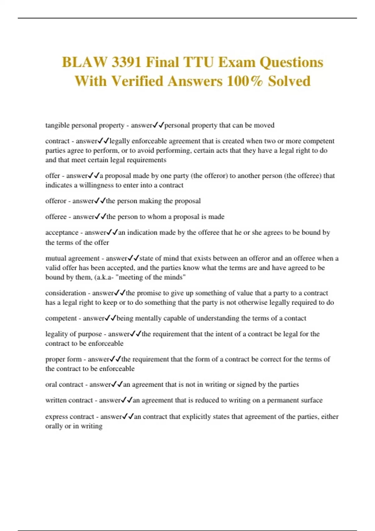 BLAW 3391 Final TTU Exam Questions With Verified Answers 100% Solved