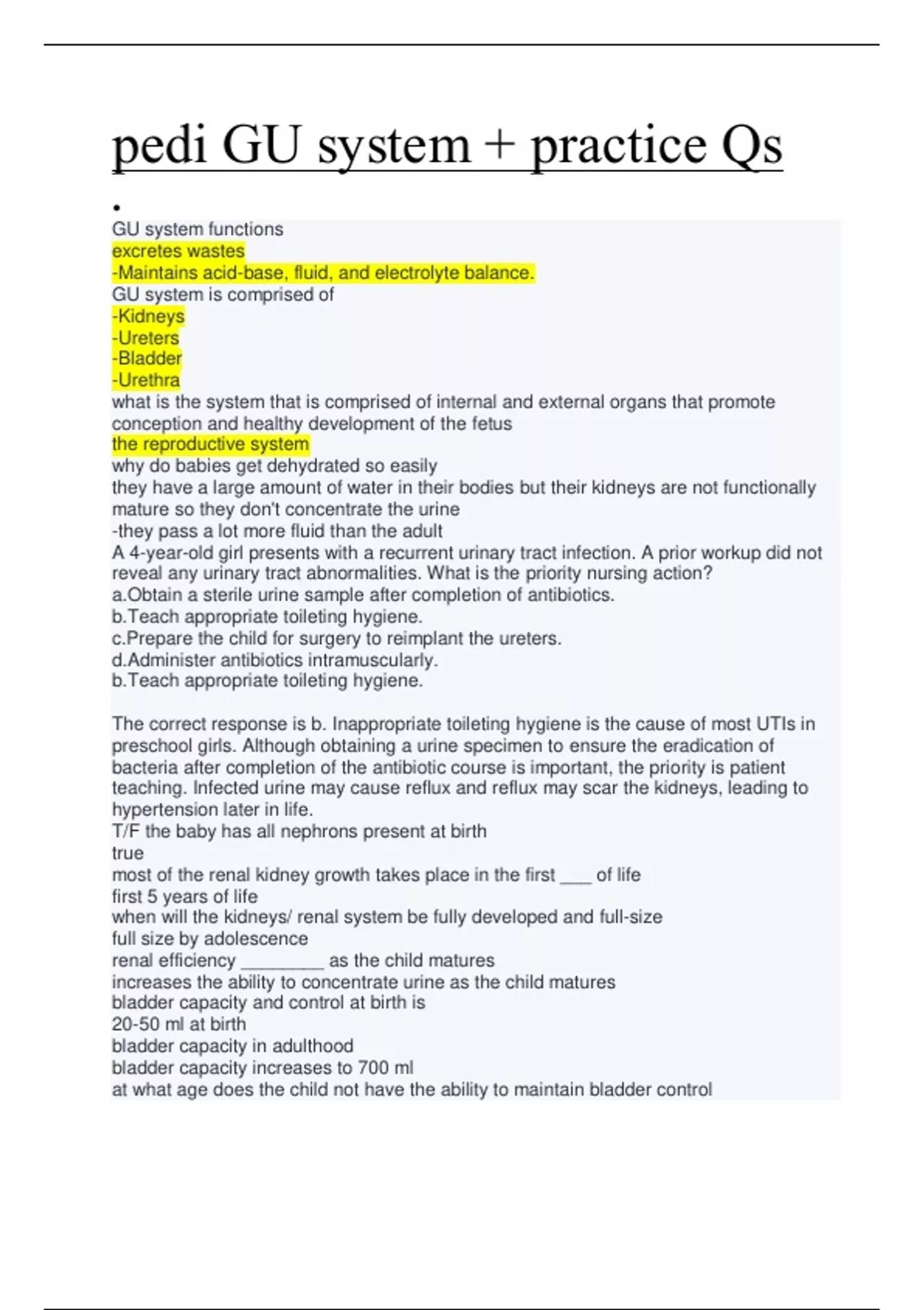 The correct response is b. Inappropriate toileting hygiene is the cause of most UTIs in preschool girls. Although obtaining a urine specimen to ensure the eradication of bacteria after completion of the antibiotic course is important, the priority is patient teaching. Infected urine may cause reflux and reflux may scar the kidneys, leading to hypertension later in life. T/F the baby has all nephrons present at birth true most of the renal kidney growth takes place in the first ___ of life first 5 years of life when will the kidneys/ renal system be fully developed and full-size full size by adolescence renal efficiency ________ as the child matures increases the ability to concentrate urine as the child matures bladder capacity and control at birth is 20-50 ml at birth bladder capacity in adulthood bladder capacity increases to 700 ml at what age does the child not have the ability to maintain bladder control