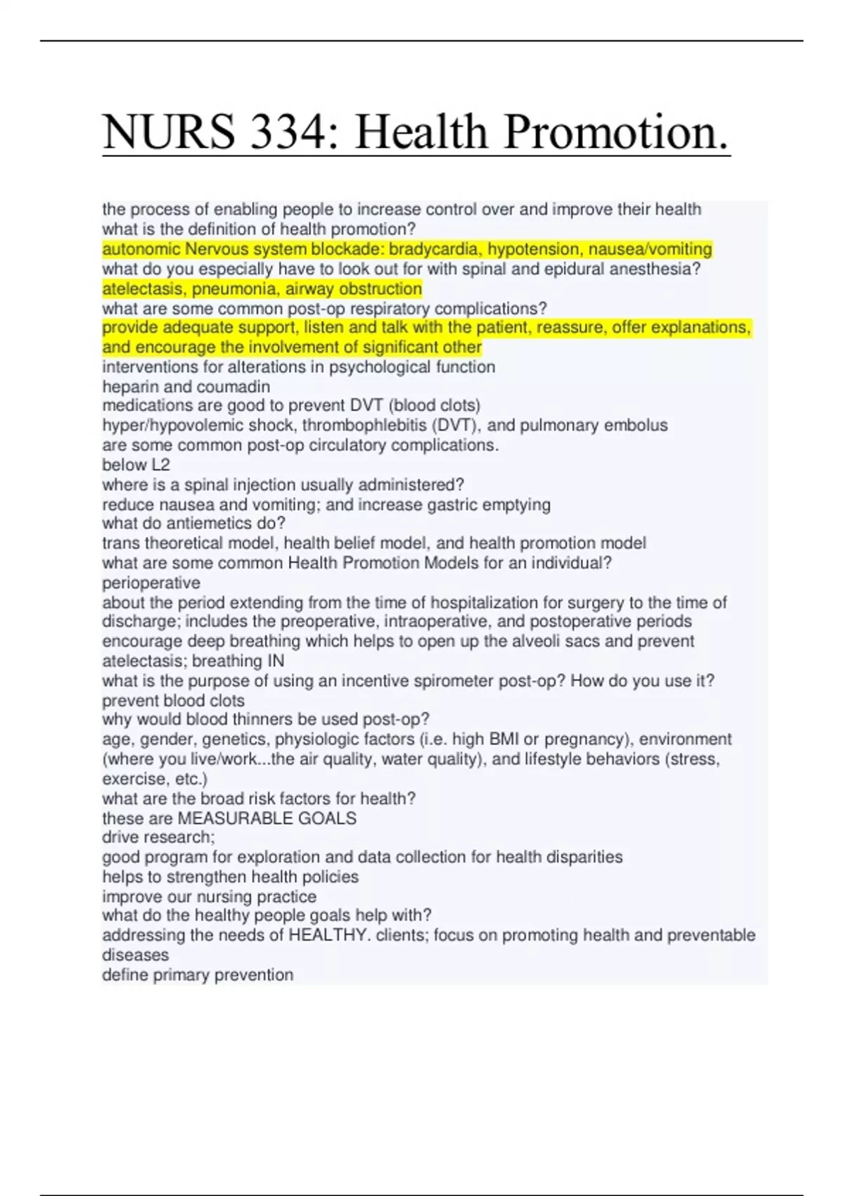 where is a spinal injection usually administered? reduce nausea and vomiting; and increase gastric emptying what do antiemetics do? trans theoretical model, health belief model, and health promotion model what are some common Health Promotion Models for an individual? perioperative about the period extending from the time of hospitalization for surgery to the time of discharge; includes the preoperative, intraoperative, and postoperative periods encourage deep breathing which helps to open up the alveoli sacs and prevent atelectasis; breathing IN what is the purpose of using an incentive spirometer post-op? How do you use it? prevent blood clots why would blood thinners be used post-op? age, gender, genetics, physiologic factors (i.e. high BMI or pregnancy), environment (where you live/work...the air quality, water quality), and lifestyle behaviors (stress, exercise, etc.) what are the broad risk factors for health? these are MEASURABLE GOALS drive research; good program for exploration and data collection for health disparities helps to strengthen health policies improve our nursing practice what do the healthy people goals help with? addressing the needs of HEALTHY. clients; focus on promoting health and preventable diseases define primary prevention