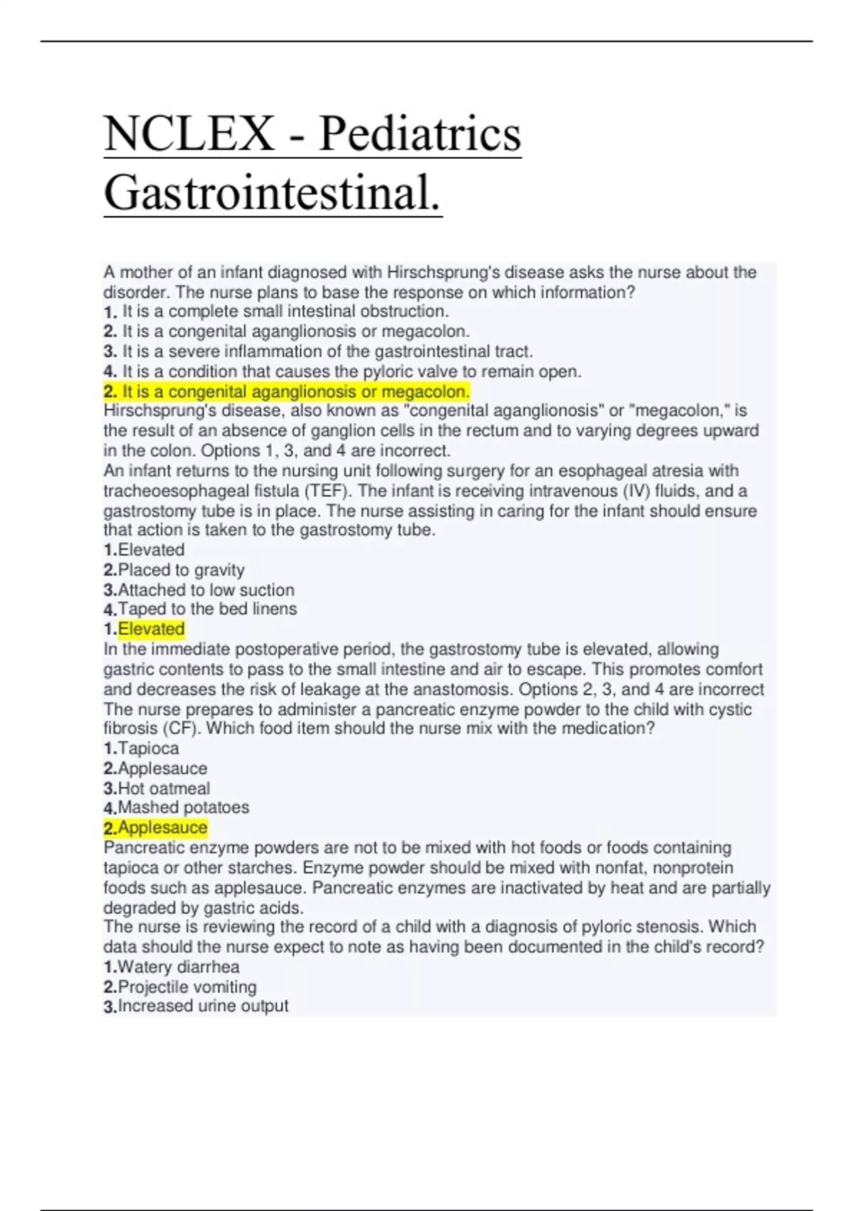 gastric contents to pass to the small intestine and air to escape. This promotes comfort and decreases the risk of leakage at the anastomosis. Options 2, 3, and 4 are incorrect The nurse prepares to administer a pancreatic enzyme powder to the child with cystic fibrosis (CF). Which food item should the nurse mix with the medication? 1.Tapioca 2.Applesauce 3.Hot oatmeal 4.Mashed potatoes 2.Applesauce Pancreatic enzyme powders are not to be mixed with hot foods or foods containing tapioca or other starches. Enzyme powder should be mixed with nonfat, nonprotein foods such as applesauce. Pancreatic enzymes are inactivated by heat and are partially degraded by gastric acids. The nurse is reviewing the record of a child with a diagnosis of pyloric stenosis. Which data should the nurse expect to note as having been documented in the child's record? 1.Watery diarrhea 2.Projectile vomiting 3.Increased urine output