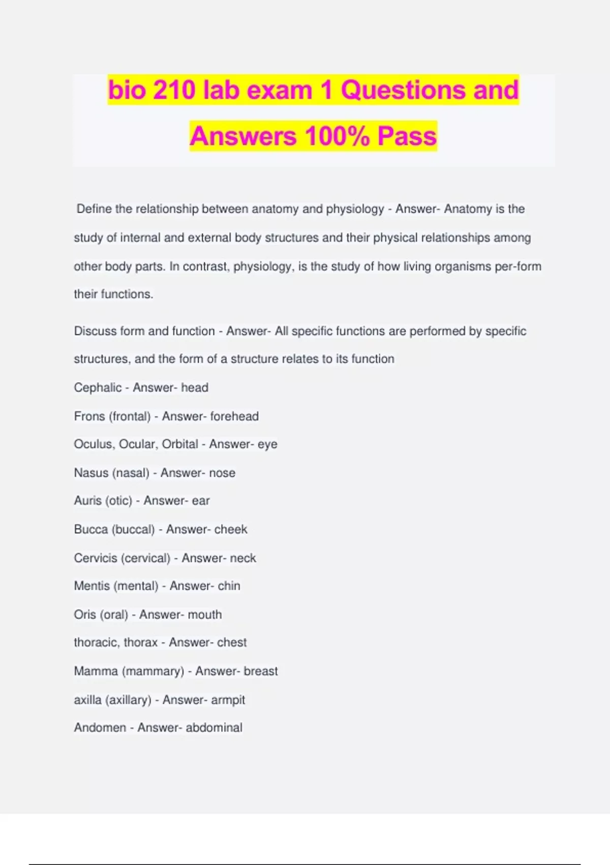 bio 210 lab exam 1 Questions and Answers 100% Pass Define the relationship between anatomy and physiology - Answer- Anatomy is the study of internal and external body structures and their physical relationships among other body parts. In contrast, physiology, is the study of how living organisms per-form their functions. Discuss form and function - Answer- All specific functions are performed by specific structures, and the form of a structure relates to its function Cephalic - Answer- head Frons (frontal) - Answer- forehead Oculus, Ocular, Orbital - Answer- eye Nasus (nasal) - Answer- nose Auris (otic) - Answer- ear Bucca (buccal) - Answer- cheek Cervicis (cervical) - Answer- neck Mentis (mental) - Answer- chin Oris (oral) - Answer- mouth thoracic, thorax - Answer- chest Mamma (mammary) - Answer- breast axilla (axillary) - Answer- armpit Andomen - Answer- abdominal umbilicus (umbilical) - Answer- navel pelvis - Answer- pelvic Inguen (inguinal) - Answer- groin pubis - Answer- pubic brachium (brachial) - Answer- arm antecubital - Answer- front of elbow antebrachium (antebrachial) - Answer- forearm Carpus (carpal) - Answer- wrist Manus (manual) - Answer- hand Palma (palmar) - Answer- palm pollex - Answer- thumb Digits (phalanges) - Answer- fingers, toes femur, femoral - Answer- thigh Patella (patellar) - Answer- kneecap