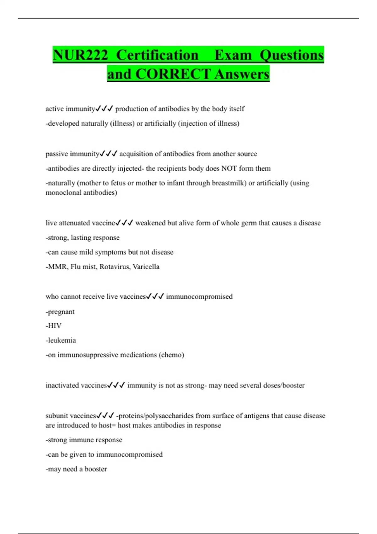 active immunity production of antibodies by the body itself -developed naturally (illness) or artificially (injection of illness) passive immunity acquisition of antibodies from another source -antibodies are directly injected- the recipients body does NOT form them -naturally (mother to fetus or mother to infant through breastmilk) or artificially (using monoclonal antibodies) live attenuated vaccine weakened but alive form of whole germ that causes a disease -strong, lasting response -can cause mild symptoms but not disease -MMR, Flu mist, Rotavirus, Varicella