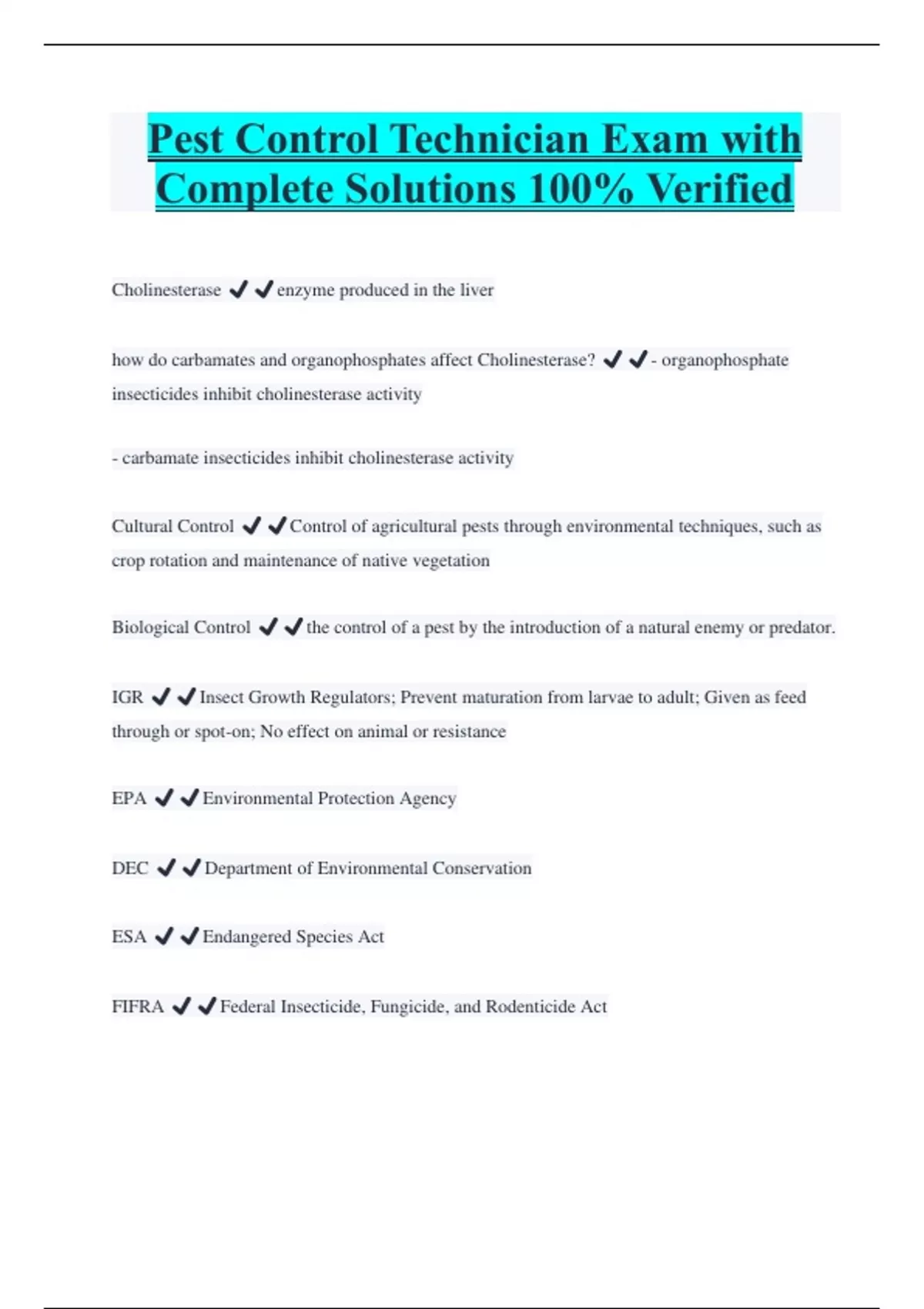Pest Control Technician Exam with Complete Solutions 100% Verified Cholinesterase ️️enzyme produced in the liver how do carbamates and organophosphates affect Cholinesterase? ️️- organophosphate insecticides inhibit cholinesterase activity - carbamate insecticides inhibit cholinesterase activity Cultural Control ️️Control of agricultural pests through environmental techniques, such as crop rotation and maintenance of native vegetation Biological Control ️️the control of a pest by the introduction of a natural enemy or predator. IGR ️️Insect Growth Regulators; Prevent maturation from larvae to adult; Given as feed through or spot-on; No effect on animal or resistance